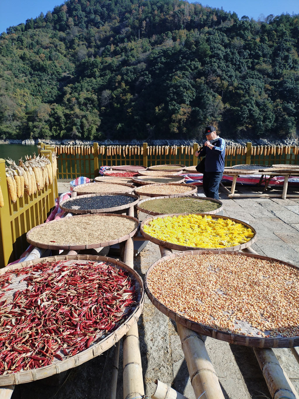 九砂村坐落于新安江畔,是典型的徽派渔村。村落沿新安江带状分布,背山面水。我们参观时,正遇上当地“晒秋”,红辣椒、黄柿子、金玉米、红豆子、黑豆子、黄豆子等层层铺展,与白墙黛瓦构成强烈视觉冲击,生动地表达了劳动者丰收的喜悦。