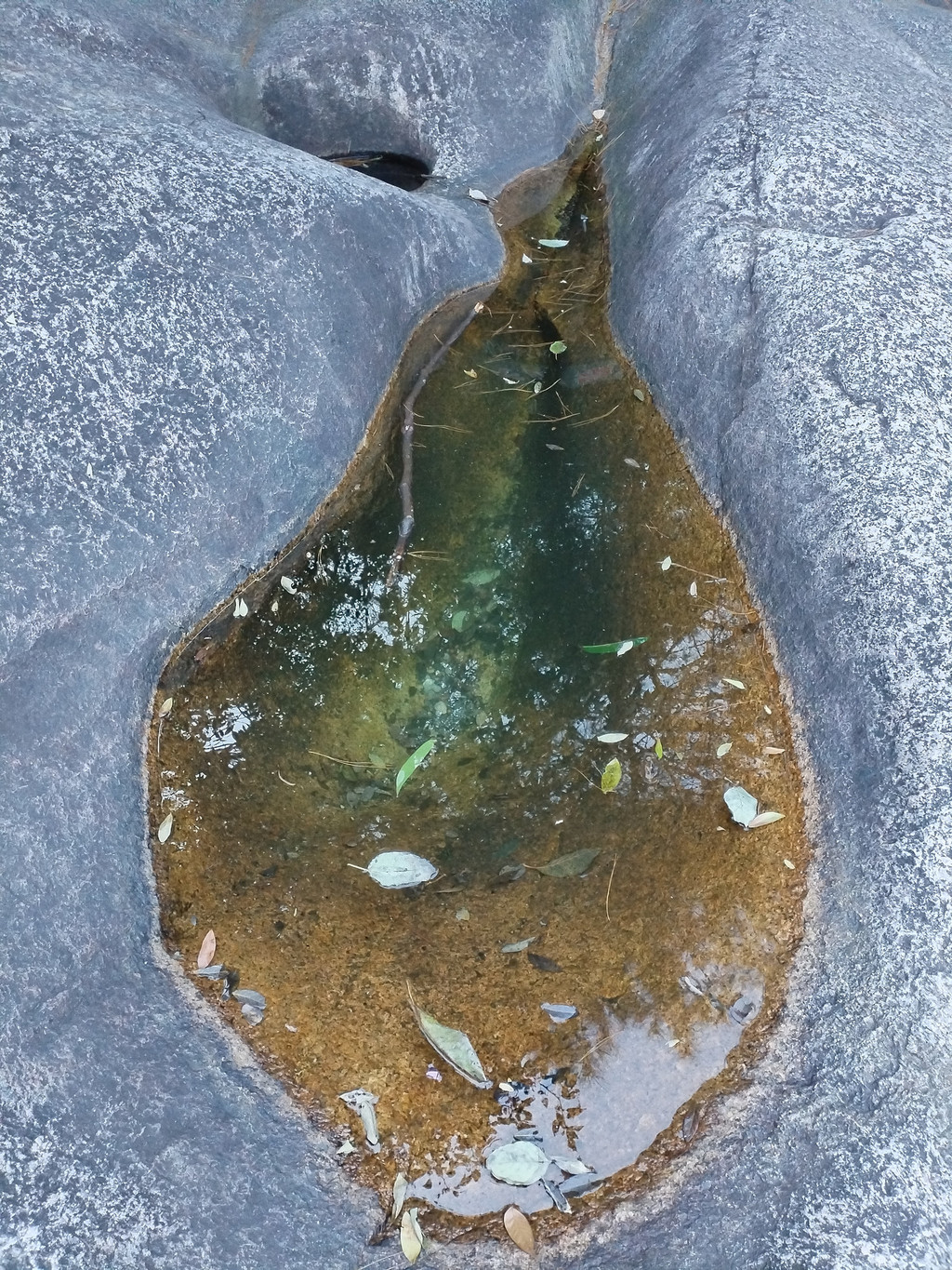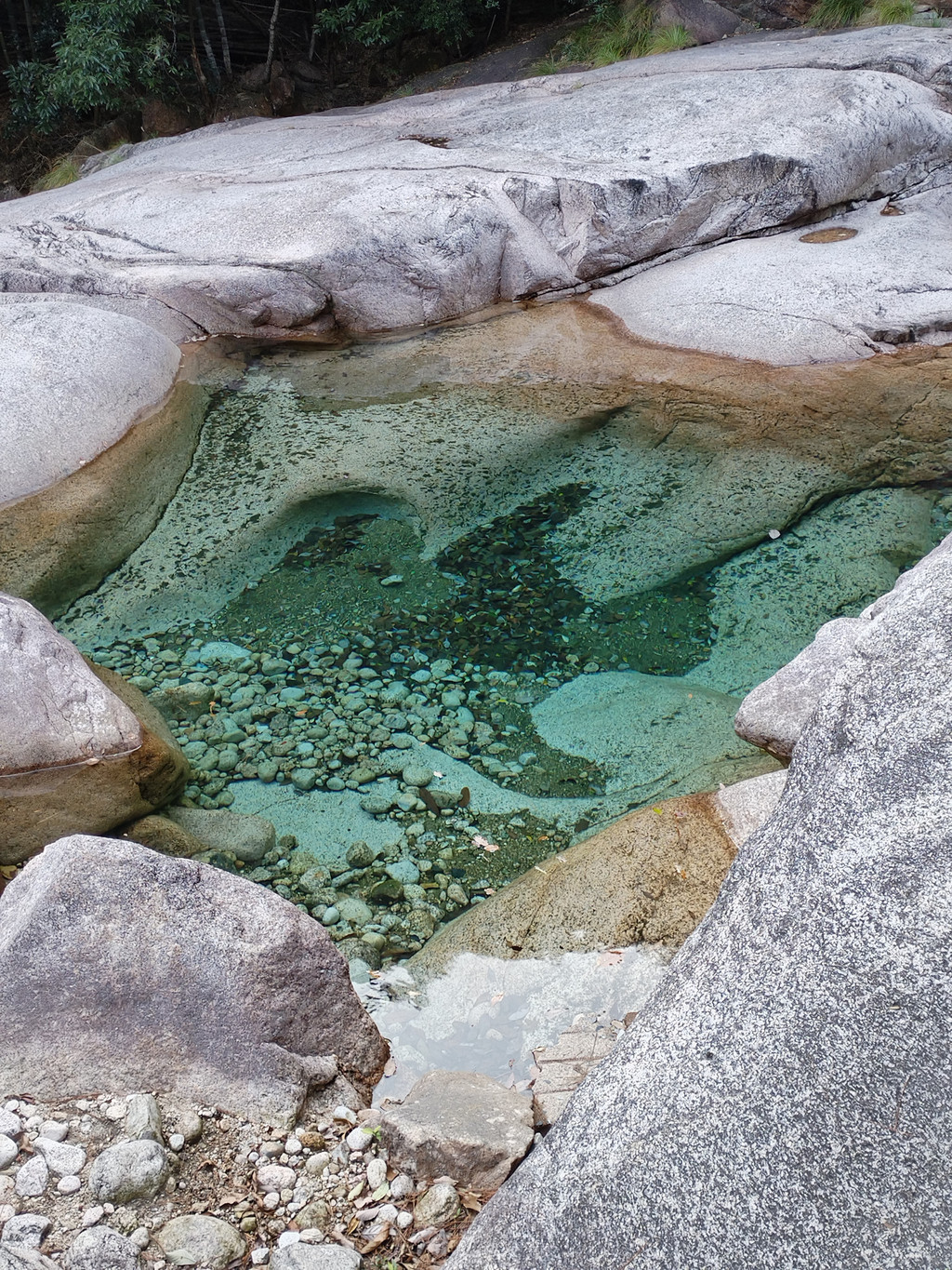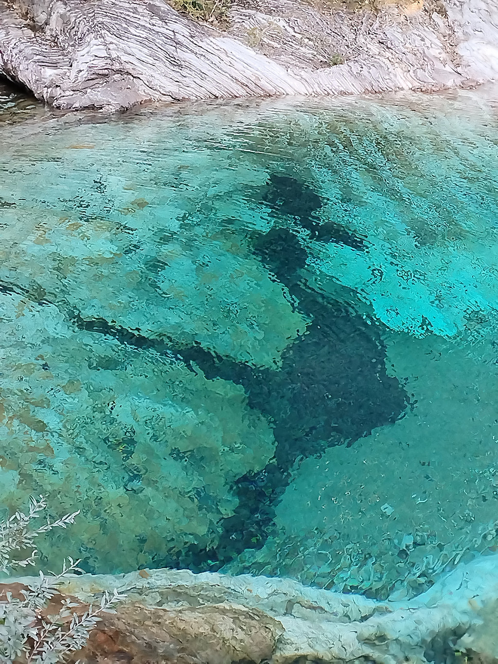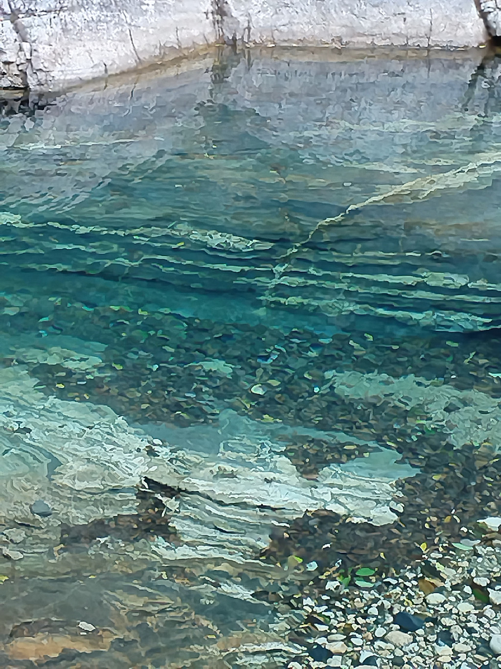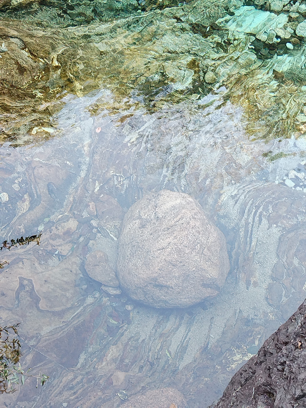 海蚌滩是第一个让我们惊艳的彩池。它的上方有一块巨石,形似海蚌,叫海蚌石;清潭中还卧着数个大小海蚌石,随着水波流动,蚌壳好像在时开时合。这种奇石和碧水的美妙组合,阿李可是第一次看到,不禁连连称奇。