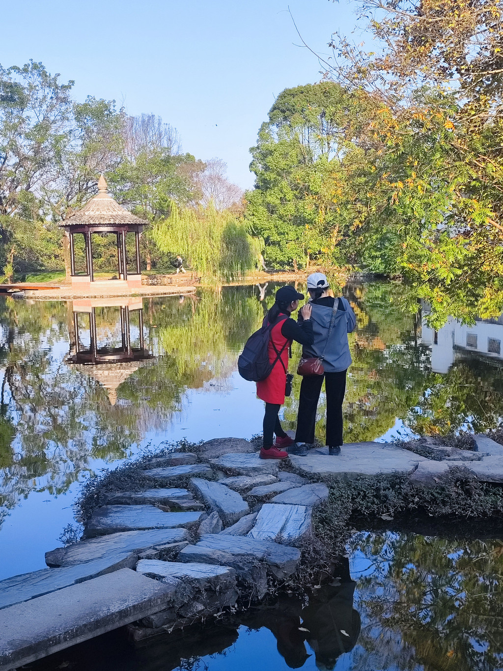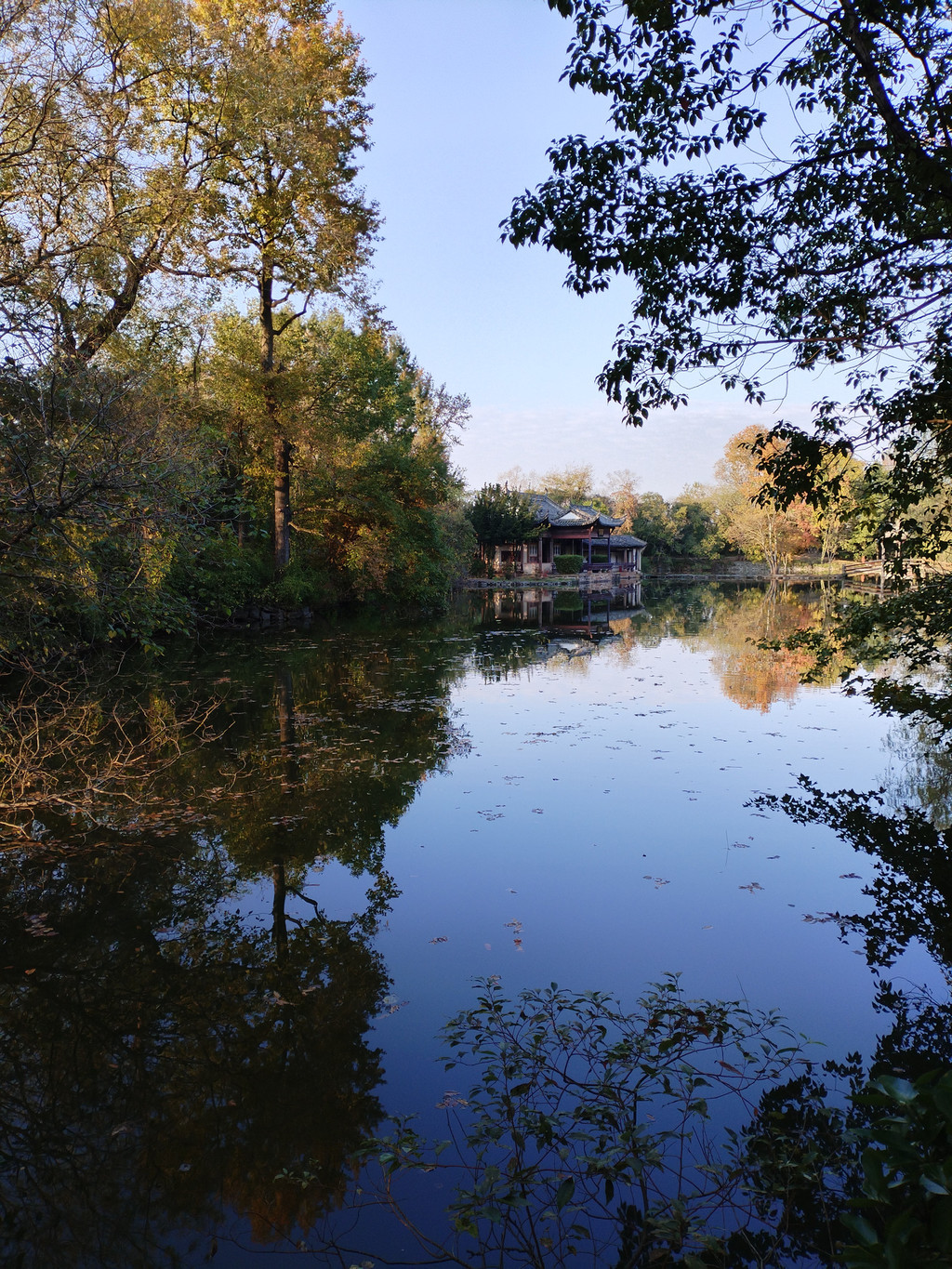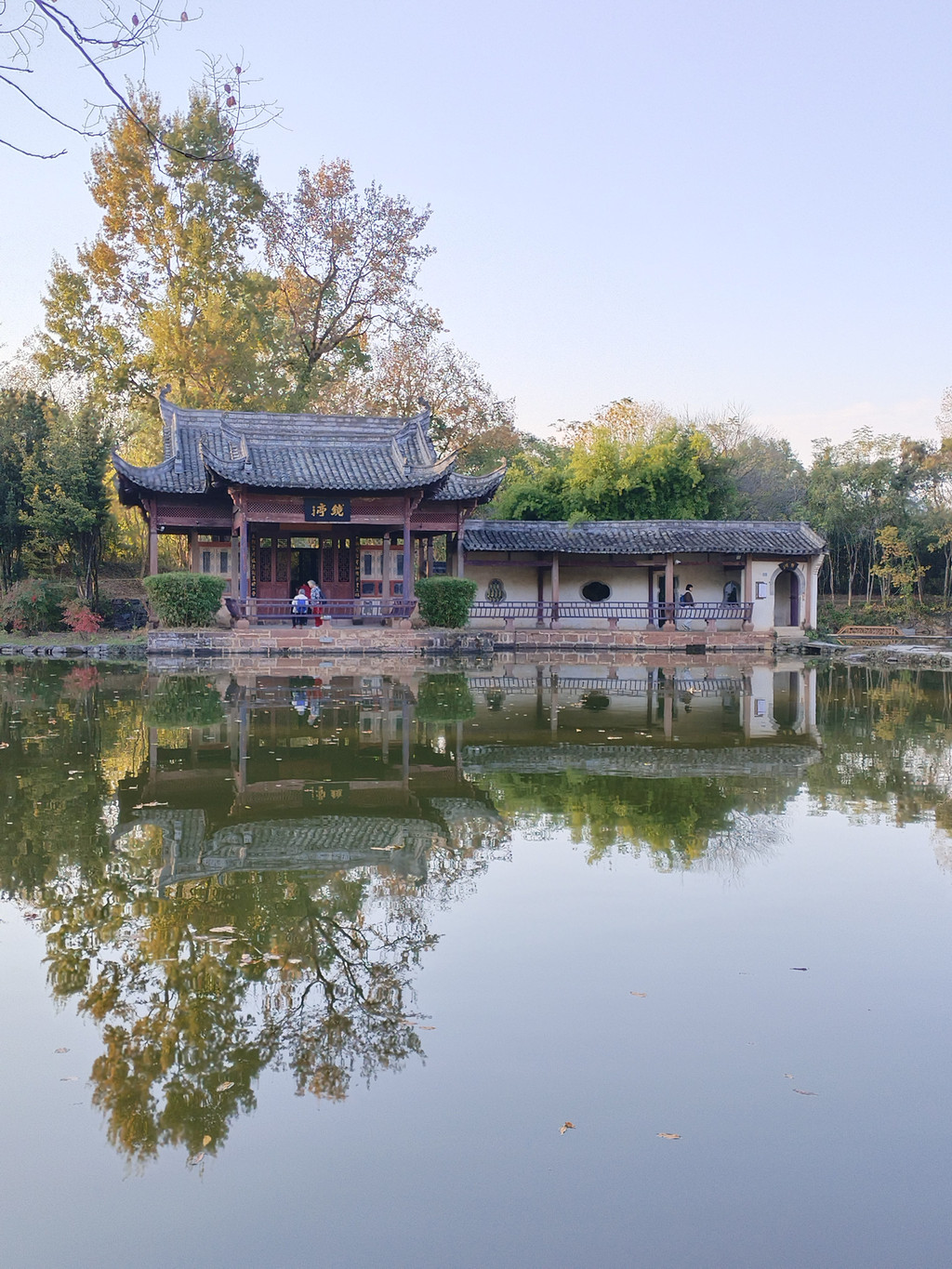 檀干园又名小西湖和孝子湖,仿照杭州西湖而建。园中有“三潭印月”“湖心亭”“白堤”“玉带桥”等景。湖心“镜亭”四壁嵌有朱熹、苏轼、黄庭坚、文征明、董其昌等18位名家书法碑刻。我们游玩檀干园时,夕阳斜照,高大的树木或绿或黄或红,和粉墙黛瓦的房子倒映在清清的湖中,绚烂若油画,美不可言!