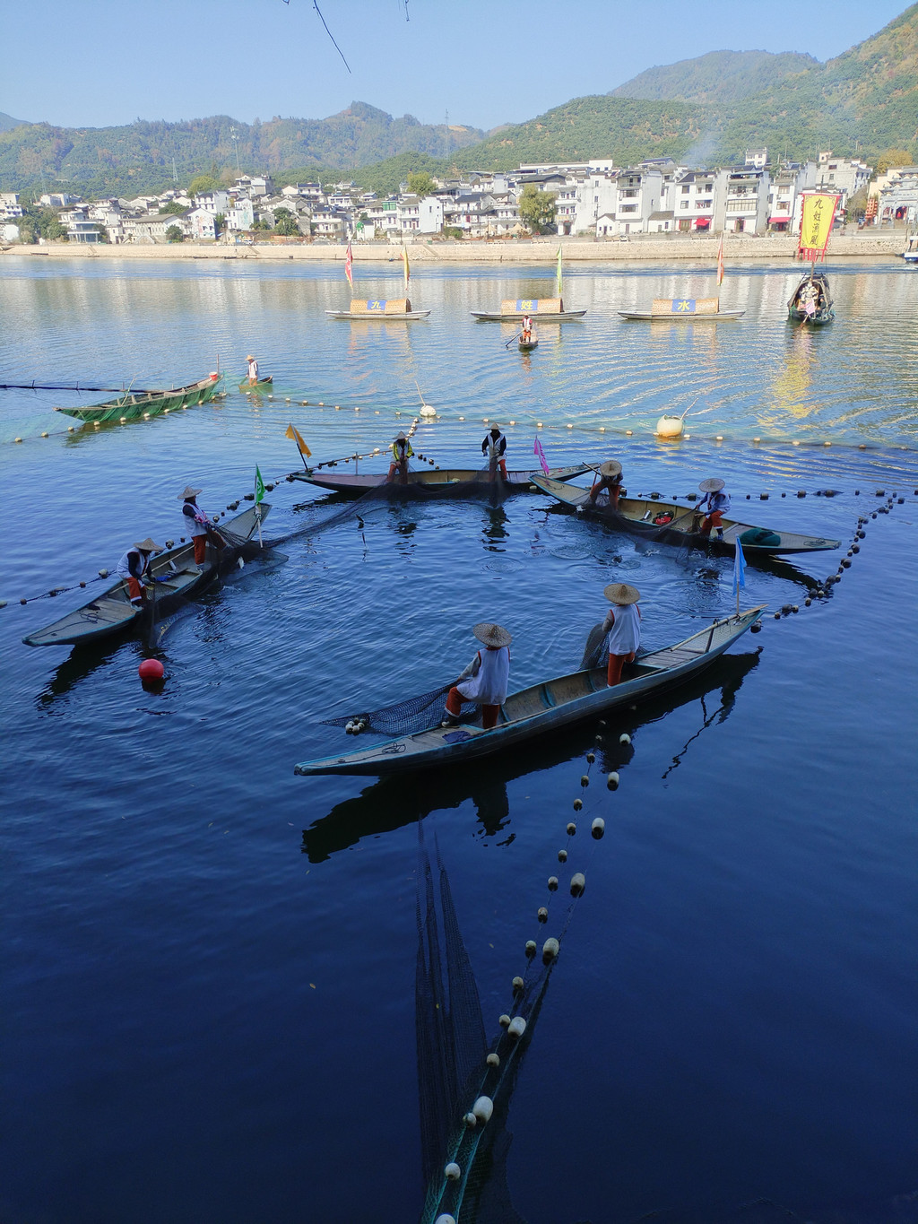 他们表演的内容还很丰富,有踏盆捕鱼、撒网捕鱼、鱼叉捕鱼、鱼鹰捕鱼(鸬鹚捕鱼)、巨网捕鱼等。这些表演对退捕渔民来说是小菜一碟,但对站在河边栈道上的我们来说,却很新鲜刺激。我们除了不停地拍照,还不停地叫好,不时腾出手来为他们鼓掌。