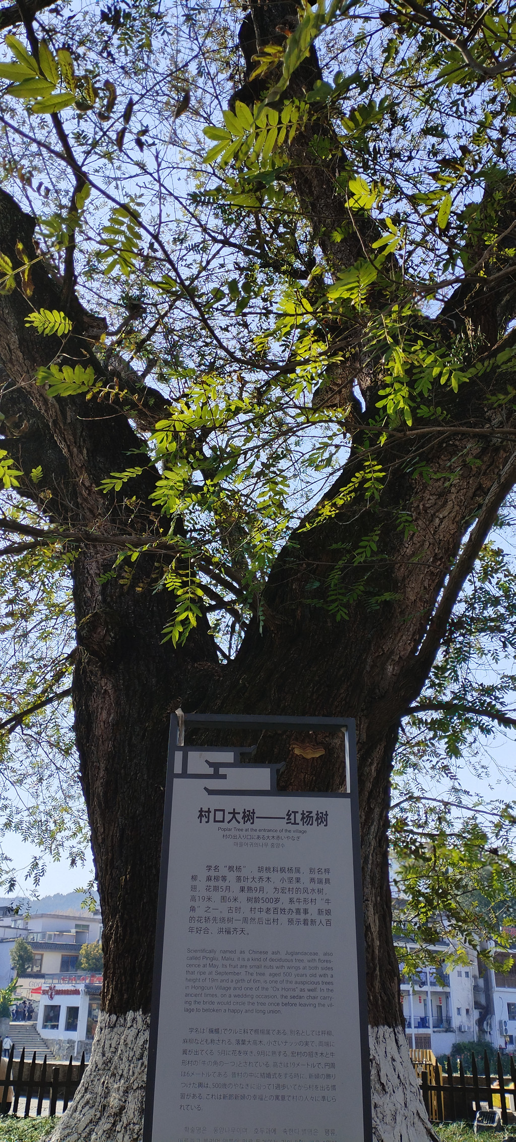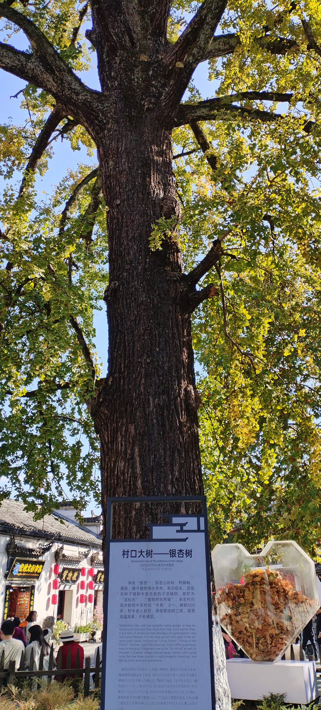 我们在宏村里漫步,先看了村口的两棵古树:一棵是五百岁的红杨树(学名枫杨),村里有红喜事(婚嫁)时,新娘花轿必须绕红杨树一周,预示新人百年好合、洪福齐天;另一棵是五百岁的银杏树,村里有白喜事(丧事)时,寿棺要绕银杏树三周,寓意高福高寿、子孙满堂。这两棵古树是宏村的风水树,也是牛形人工水系中的两根牛角。