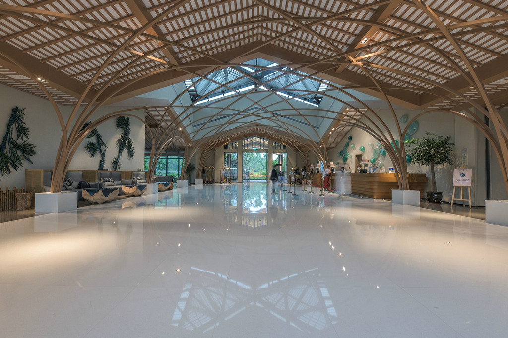 比如眼前这家度假村酒店就是安吉县众多奢华型酒店中的一个代表,它也是世界著名的品牌之一。酒店名字也是相当的时尚,它就是club med 安吉度假村。此场景是山野君在该酒店大堂拍摄的,看起来就觉得很高大上。