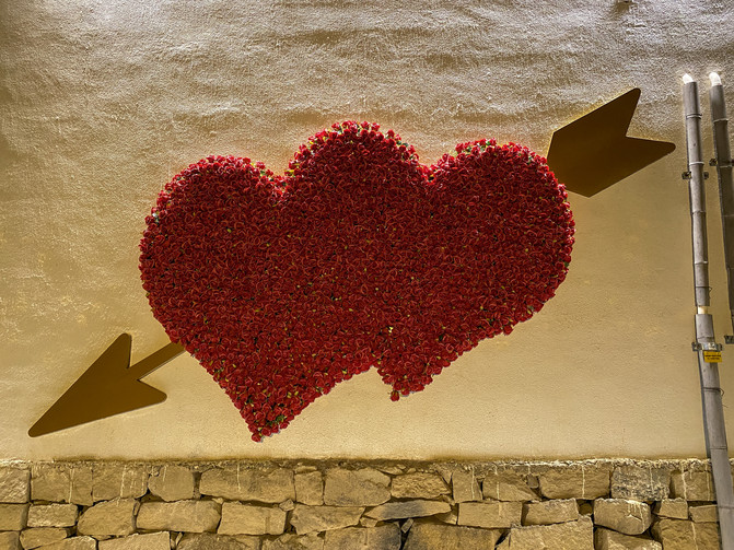 这里还有修整整齐的花朵。在林间小道上,花丛被修剪成为了爱心的形状,草坪远远看去也是曲线优美。游客们置身其中