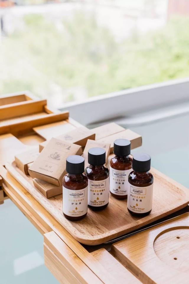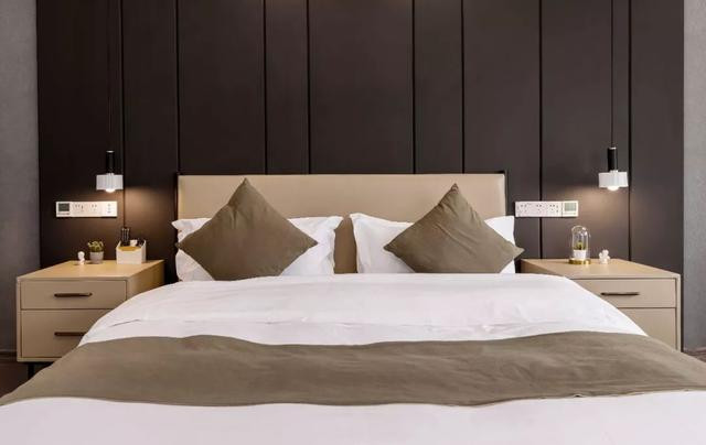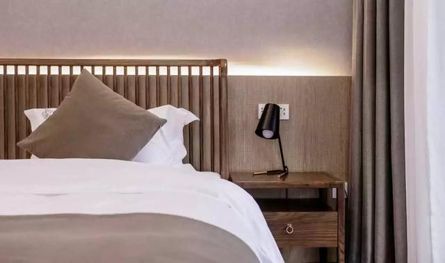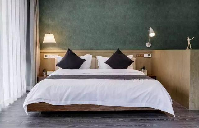 民宿的设计并不需要追求规模或奢华,但能够体现民宿的特色最为重要。复古的吊灯以及家具搭配床靠背大面积的黑色硬包,表达出强烈的视觉感。床头两侧都设计有床头灯,旅行疲惫的人们,或静静的躺在床上,听一阵竹林晚风,或椅座案头写写游记,翻翻旅行攻略,让白日的疲惫在此全都消散。每一间房间都配置了浴缸、地暖、中央空调、智能马桶、电动窗帘,让客人即使来到乡村小舍,也能感受五星级酒店的硬件配套。原木的温和配合柔和的纯棉床品、室内墨绿的墙纸宛如窗外郁郁葱葱的绿林,构成一个素雅、空灵的舒适居室。卫生间三面通透,用白纱阻隔,增添小小的情趣。马桶间和淋浴区都做了隔断,不仅干湿分离,使用也可以互不影响。