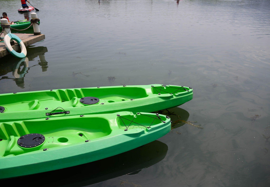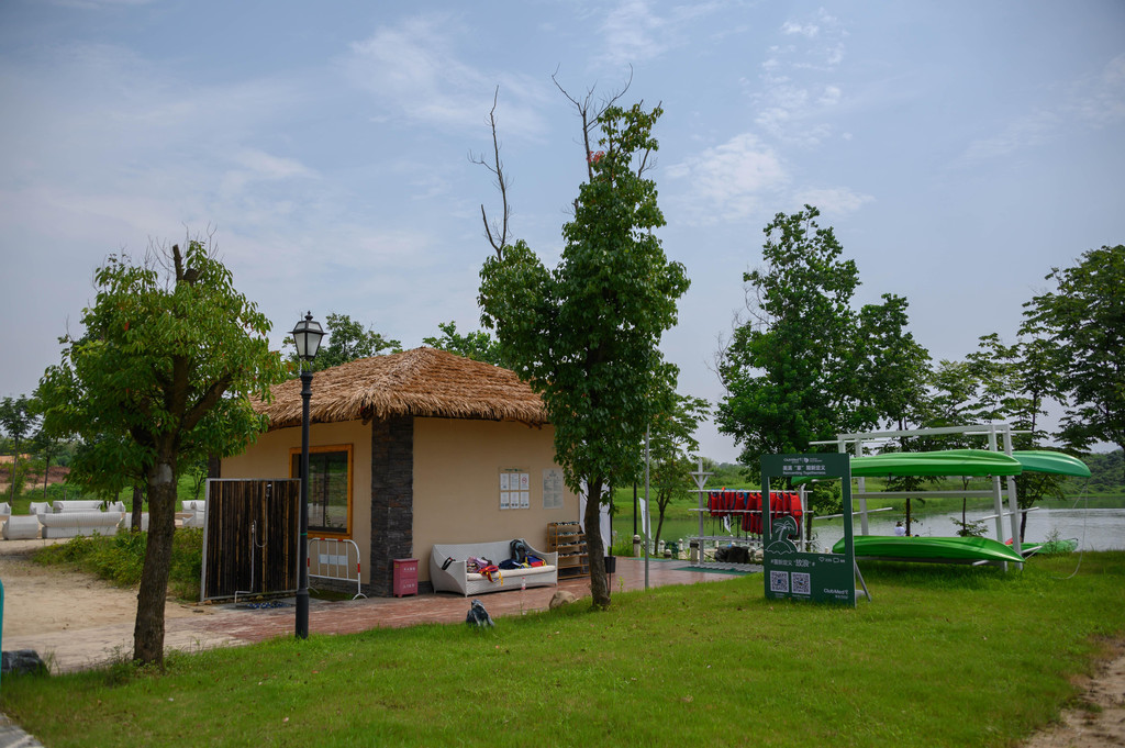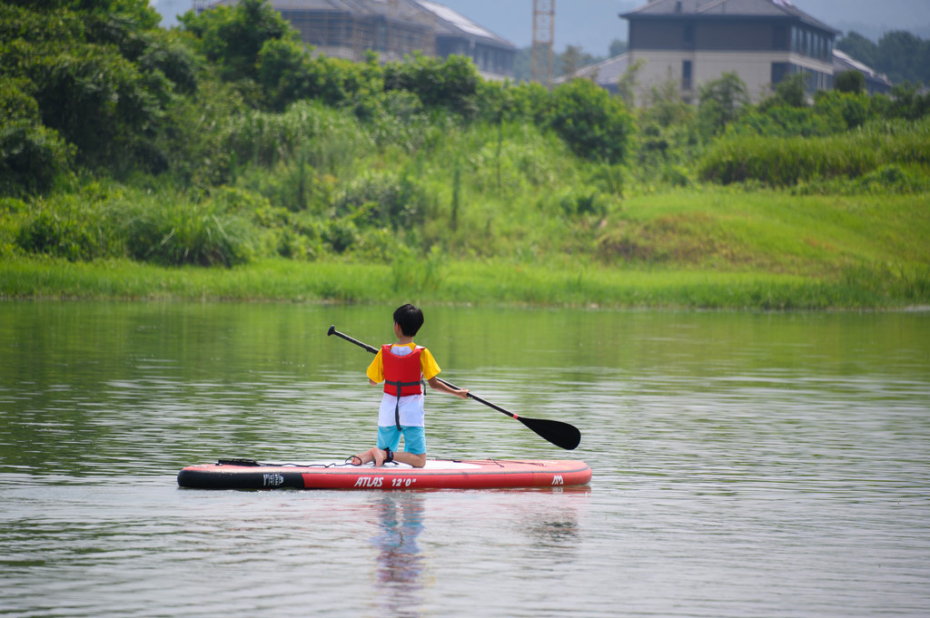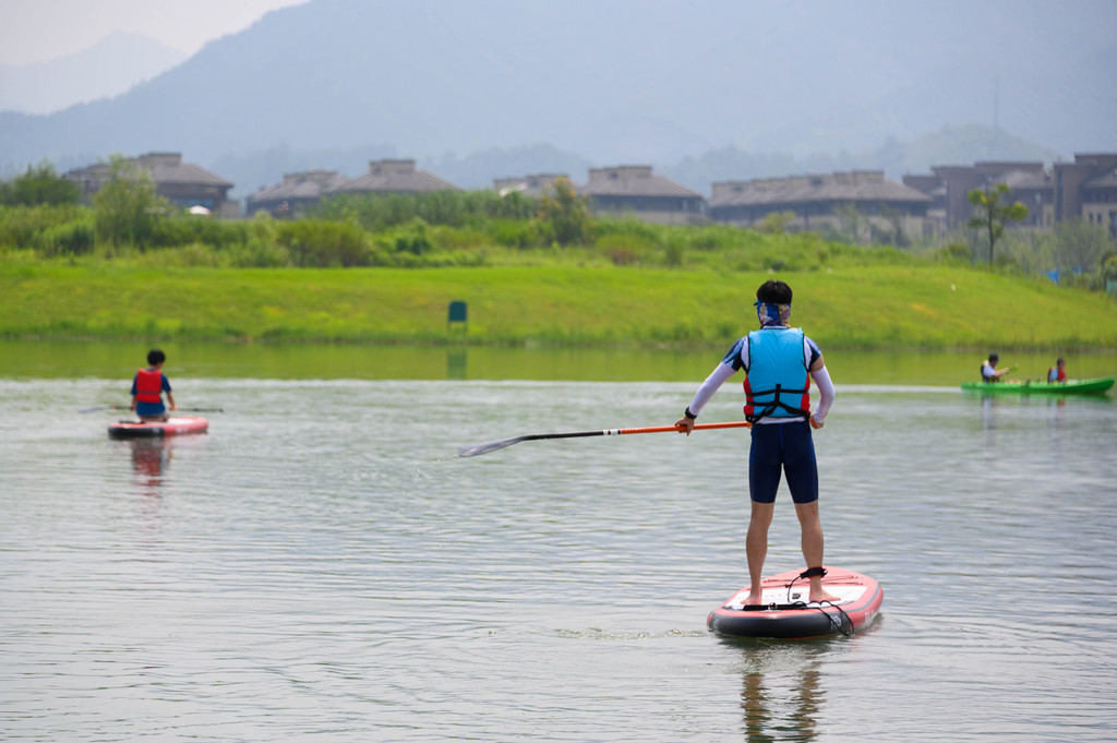 这里就是举行水上项目的湖边了,有单人皮划艇、双人皮划艇、站立式滑板等,需年满8周岁且会游泳。