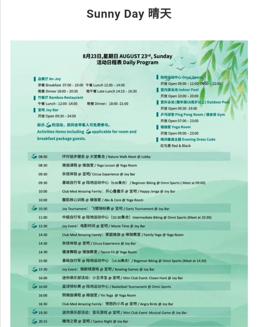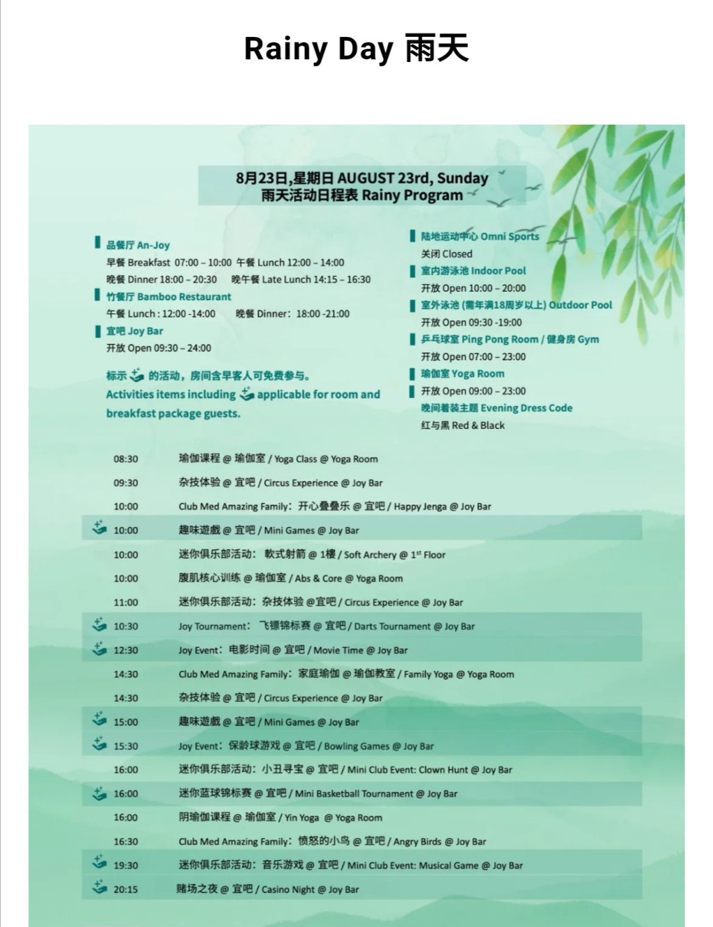 度假村针对晴天和雨天都有不同的玩乐项目安排