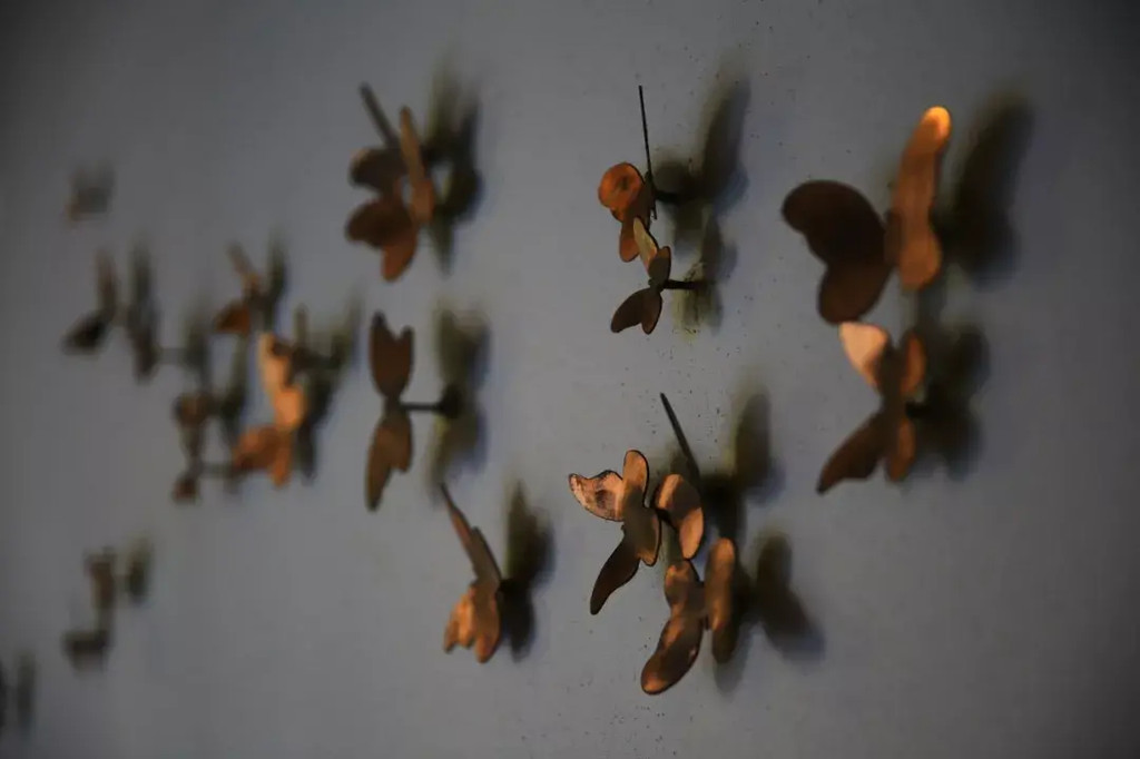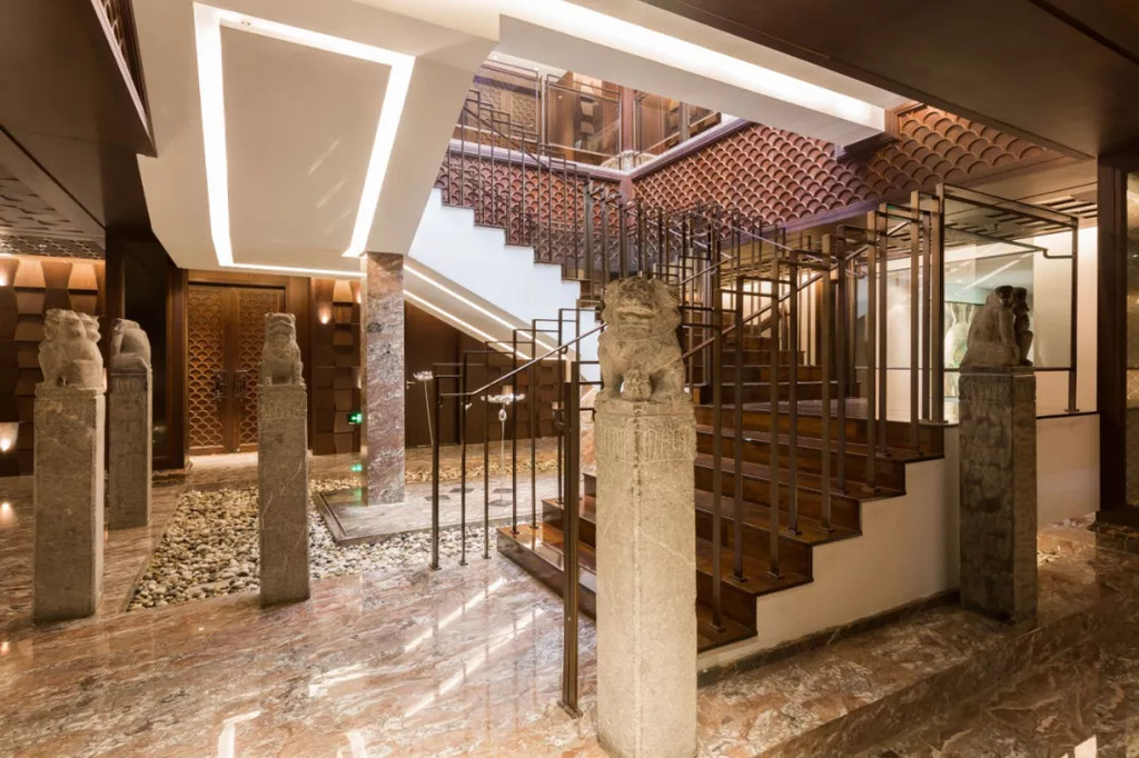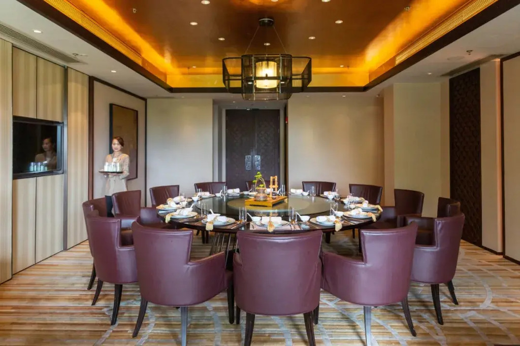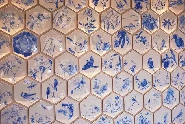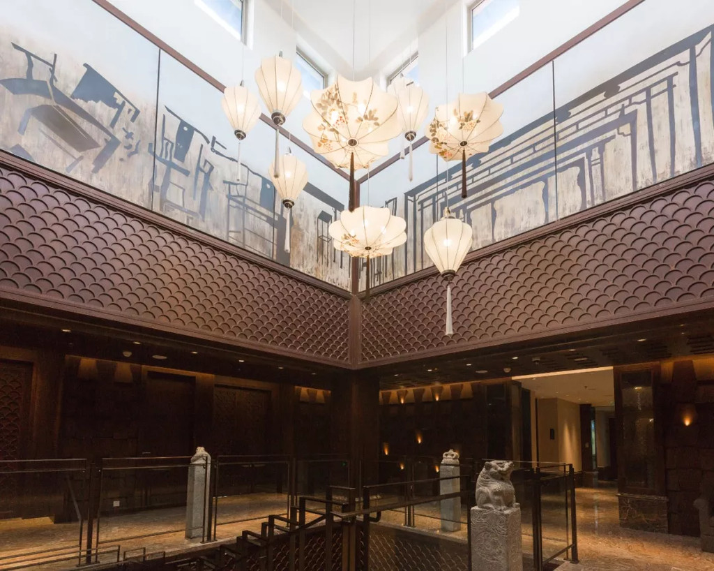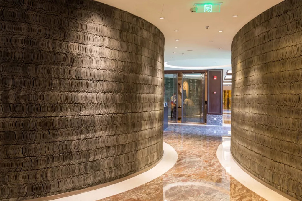 漫步在酒店餐厅区域的走廊上,你会在转角遇到飞舞的蝴蝶,而青花瓷与中国风碟盘点缀的墙面,展现出浓郁的中国风,但最让为印象深刻还是搬上了墙面的湖笔。独具特色的青色瓦片也吸引着前往美食殿堂的宾客。