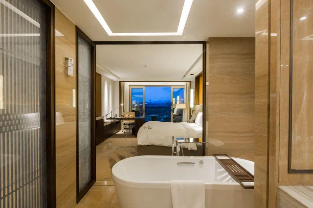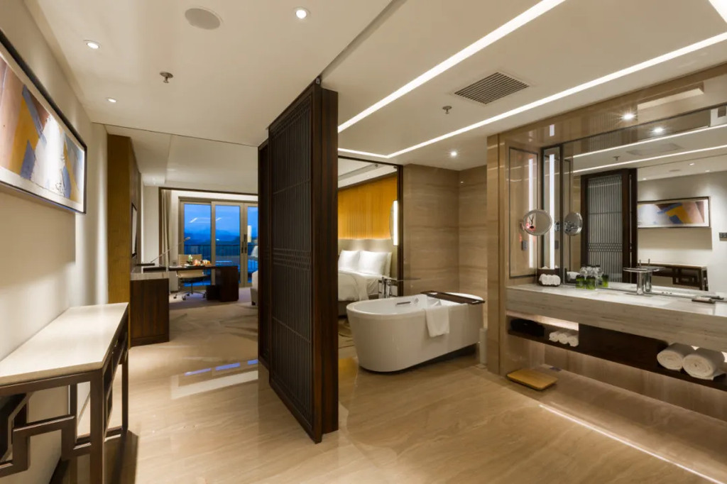 酒店的客房设计取材于安吉的秀丽风貌,采用木雕屏风、天然物料及柔和灯光等有机元素。