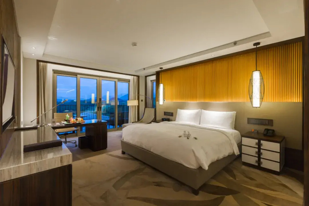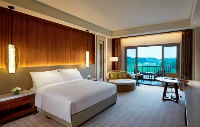 酒店共设有 228 间风格典雅奢华设备齐全的客房以及套房,氛围舒适休闲。大多数客房均可欣赏高尔夫球场的绝美景观,其中 154 间客房设有私人阳台,酒店完美地将中国传统的古典韵味与现代的时尚优雅融为一体。