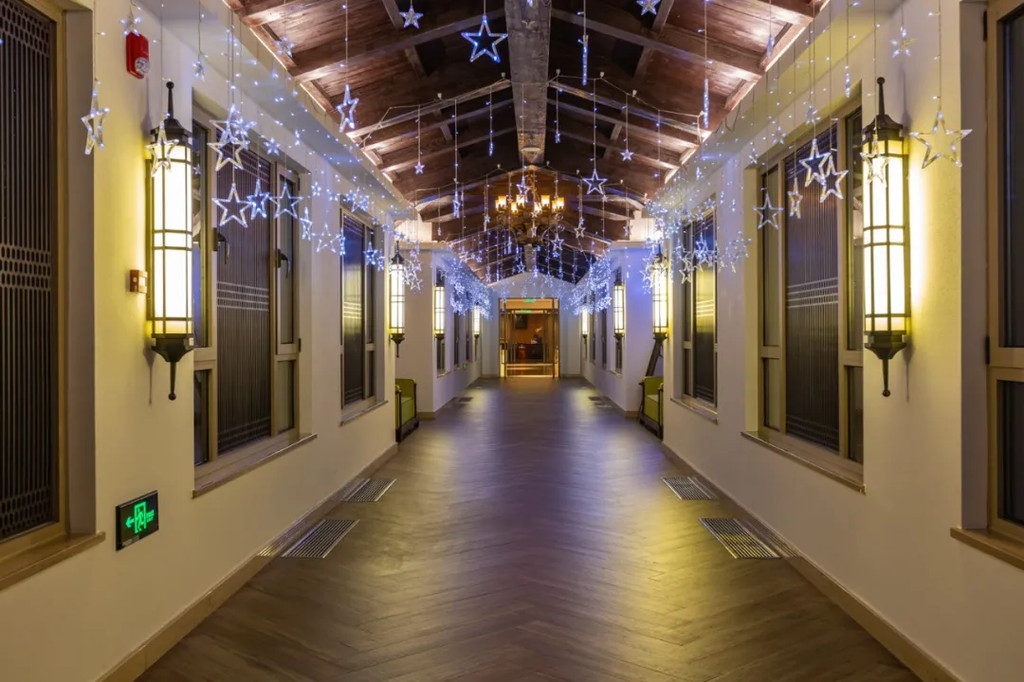 酒店客房的长廊上挂满了星星灯,据说迪丽热巴与邓伦的热播剧《一千零一夜》曾在此取景,如今也是许多宾客喜欢拍照打卡的地方。