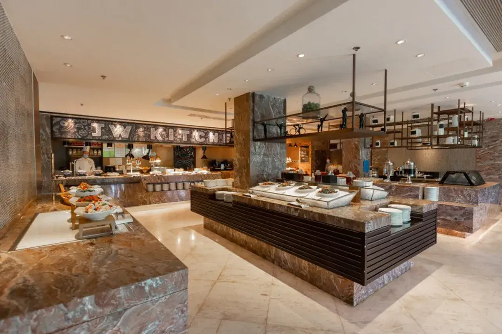 JWKitchen全日餐厅,这里有开放式的自助餐,菜式融汇了当地美食与世界各国的美食应有尽有,还有户外的餐位,如果你喜欢更好的融入大自然,全日餐厅的露台是不二选择。