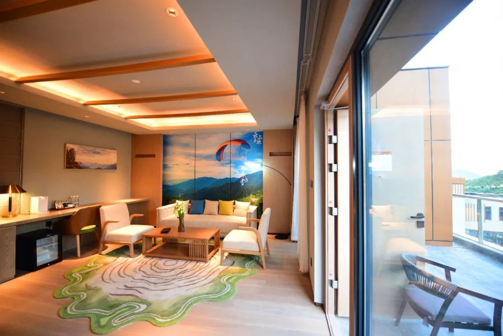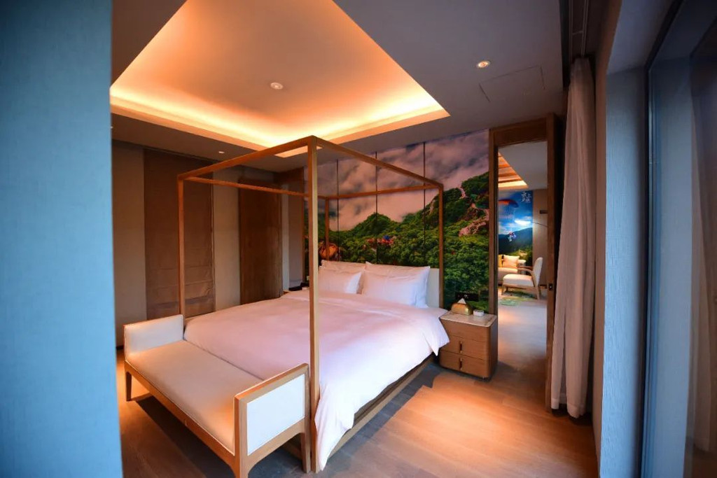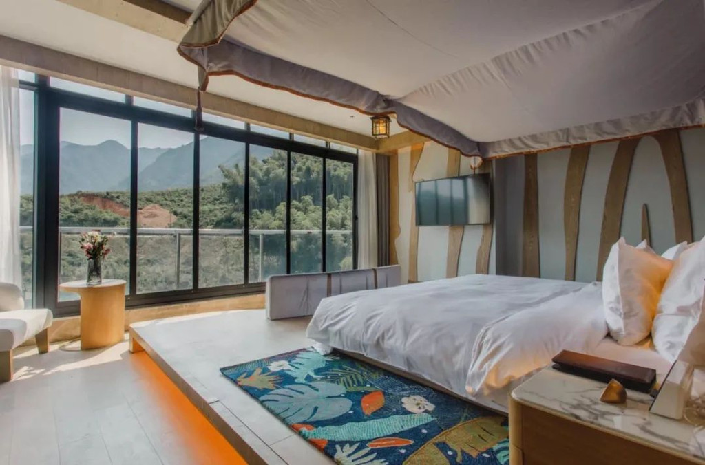 我们入住的房间,客房里巨幅的落地窗,将室外的山景引入室内,翠绿的竹林、碧蓝的天空,都可一览无余。