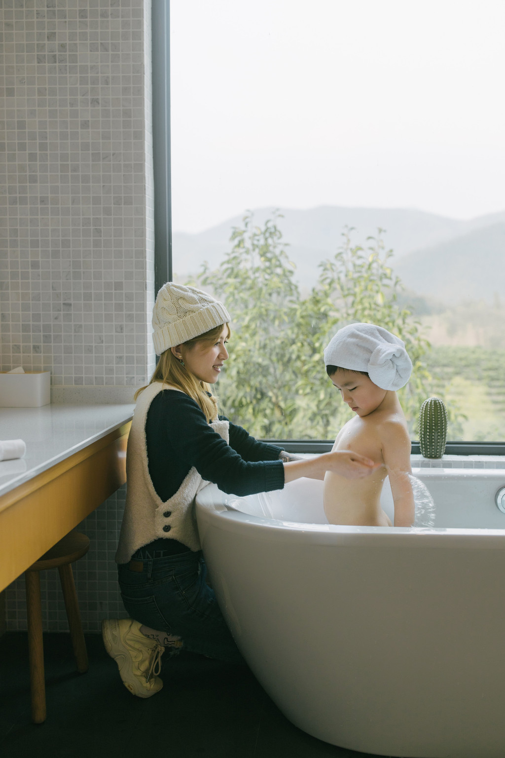休息片刻,我说准备去泡温泉了,狍哥立马把自己的小泳衣拖出来,换好,包好浴巾等着出发!哈哈哈,看来泡温泉的诱惑远远大于泡浴缸啊!瞧,一路小跑迫不及待的样子~ 虽然天色已暗,但丝毫也不影响我们边泡澡边看着外面竹影婆娑的美景,点开温泉池周围的蜡烛,暖黄暖黄的灯光,别有一番风味。 淘气的狍哥,发现了蜡烛不灭的秘密~ 这里的温泉,需要提前和管家小姐姐预约的呦~每个时间段都安排满的,所以一定要提前预约好你想要泡澡的时间段。 泡好澡,回到房间,衣刀发现手机APP提醒车子副驾驶的车门没有关紧,赶紧又下去检查一遍,狍哥看到地上印着的WEY 很好奇,大声的念了出来:“这字母我认识,学校学过的!W &