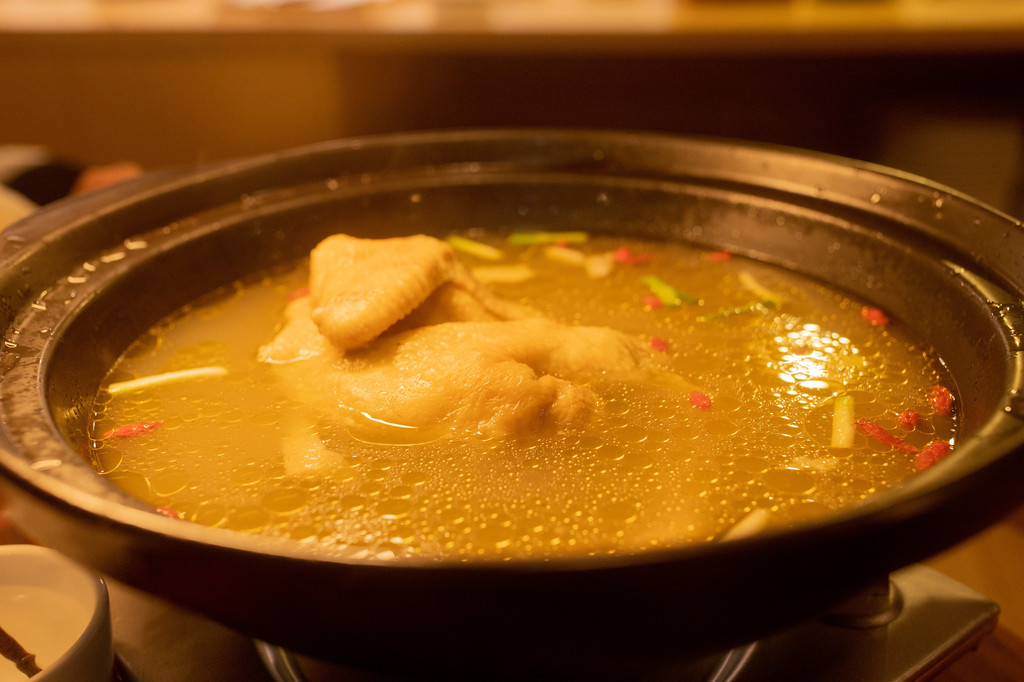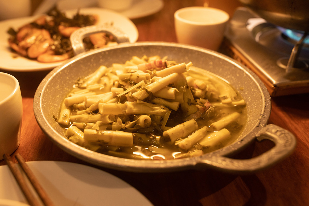 今天的晚餐我们就在民宿就餐啦~ 炖鸡汤,茶叶炒虾,还有当地特色的炒冬笋。