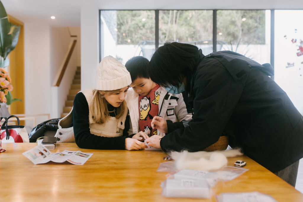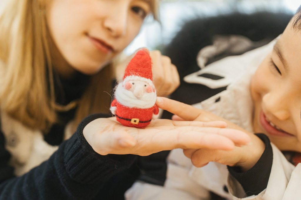 终于如狍哥的愿,我们赶上了制作圣诞老人的活动,狍哥听工作人员小北姐姐讲解如何制作,我也是第一次亲手戳毛毡,还是相当好奇的,没想到不同颜色的毛毛,用小针就这么一直戳,就能戳出可爱的物体来。当然这也非常考验你的耐心。