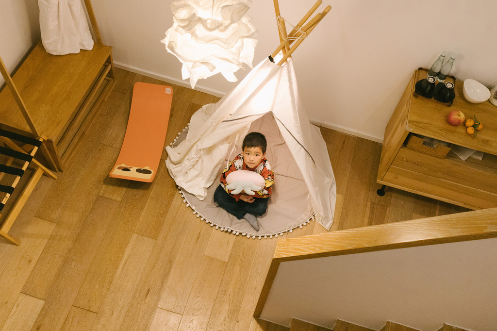 在楼上玩了一会,才发现楼下还搭了个印第安的小帐篷,狍哥速度的跑下楼占领了。