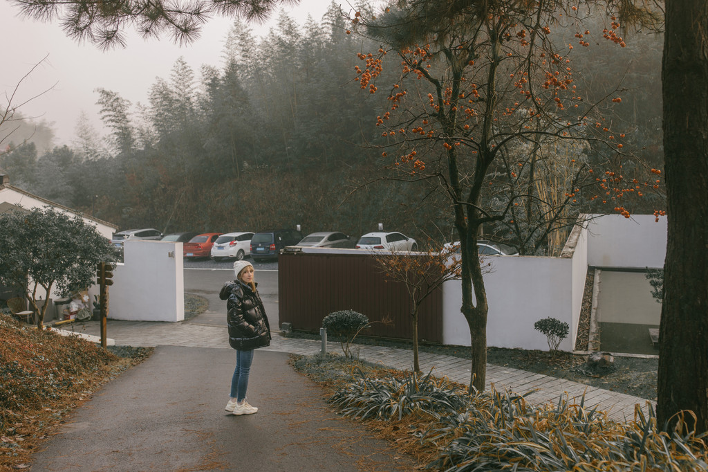 带上狍哥来安吉泡个温泉驱寒,想趁着还能见到几颗未落的柿子,