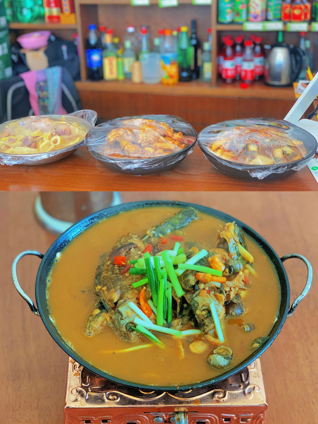 铁板鱼(铁板鱼绝对是必点的菜,铁板鱼里可以放上你自己喜欢吃的菜品,乐乐推荐必须要点乌冬面和土豆,这些食材和肥美的鱼一起在铁板上烂炖,面条和土豆吸收了鱼汤的鲜香,绝对的入味,让你一口接一口,停不下来!)