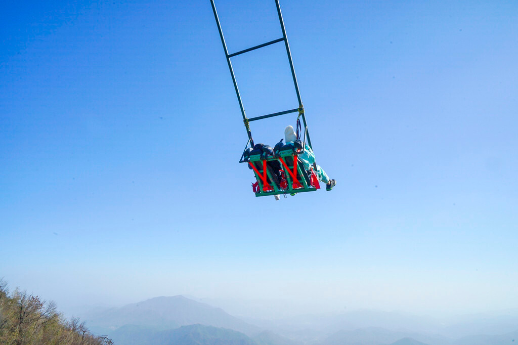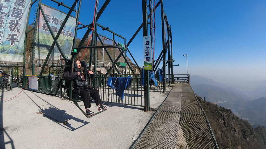 相对来说,我是比较胆小的,远远地看到悬崖荡秋千和高空玻璃桥,我腿都要软了。哈哈。我真是个软妹纸。这个还是因人而异的。真心佩服一起的小伙伴,看到悬崖荡秋千,一马当先,勇往直前的样子,哈哈。真心勇敢!佩服佩服!悬崖荡秋千会先把人定位在一个很高的位置,我看着都要晕了。吓死我了。真的是勇士啊!随着荡秋千荡出悬崖的那一刻,尖叫和呼喊,直到秋千的自然平衡晃停。感觉荡到后面,坐在秋千上的人也没有这么害怕了,而是享受在高空荡秋千的乐趣,从不同视角欣赏悬崖上不同的风景。不过我还是不敢尝试,哈哈。留给胆子大的人吧。
