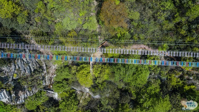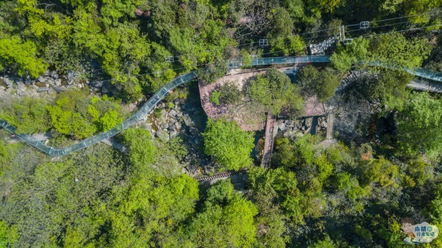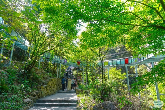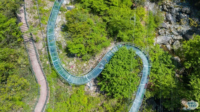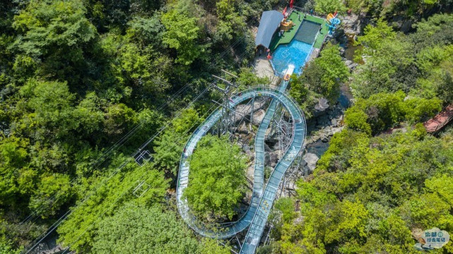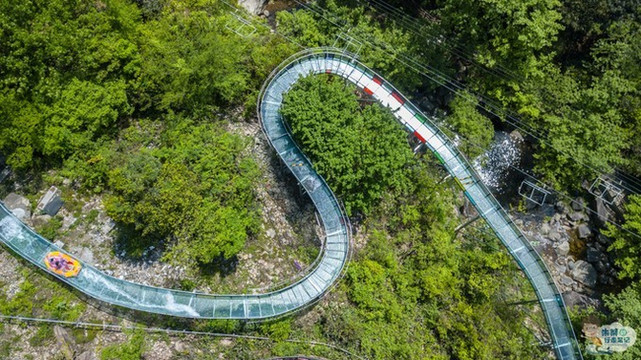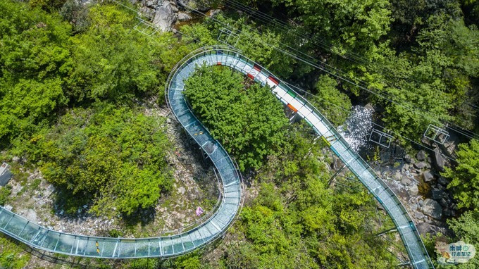 在高空玻璃吊桥之下便是浙北大峡谷空中漂流,全长1480米,落差达138余米,漂流滑道多处呈S型、U型、360度大回旋,仿佛一条即将腾飞的巨龙,气势非凡。在炎炎夏日里,凉爽刺激的漂流之旅就会让你知道什么叫做“大起大落”,刚刚攀上“人生巅峰”,立马就被“抛到谷底”。