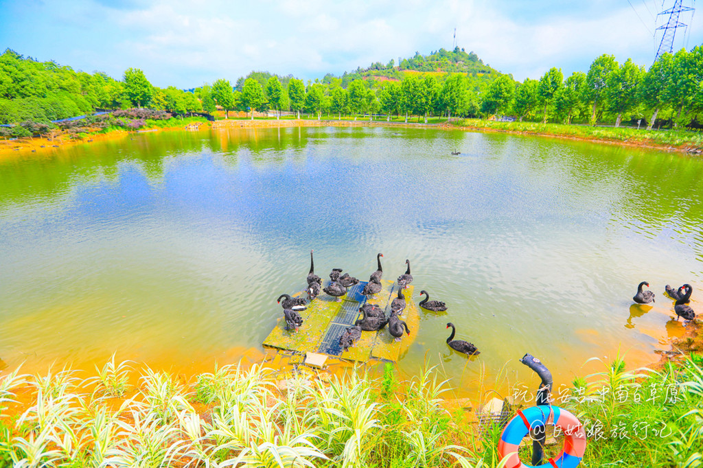 大草坪中间还有蜿蜒的小溪,天鹅一家正悠闲地戏水。小天鹅宝宝好可爱啊!