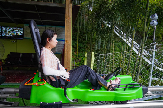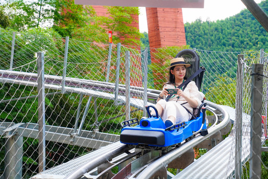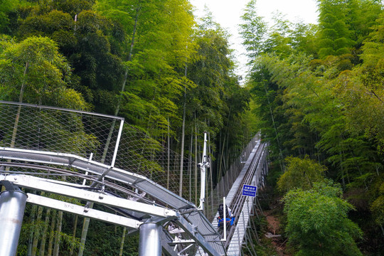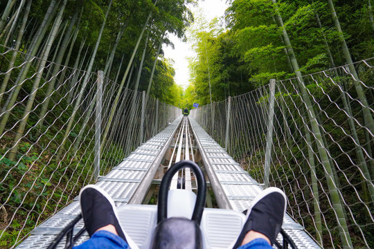乘坐竹海滑道登顶观竹海波澜,竹海滑道是目前华东地区最长最刺激的滑道之一,可以滑下高山,也可以攀上山顶。运行过程中,还会经过较高的支架区,最好处15米,弯道、跳跃、盘旋的架设增加了滑行的刺激性。
