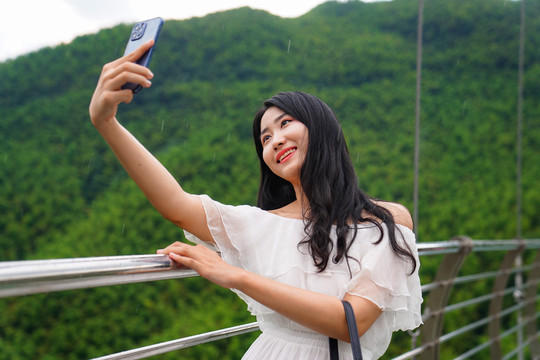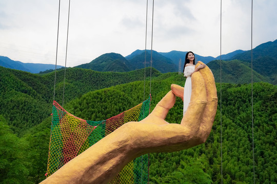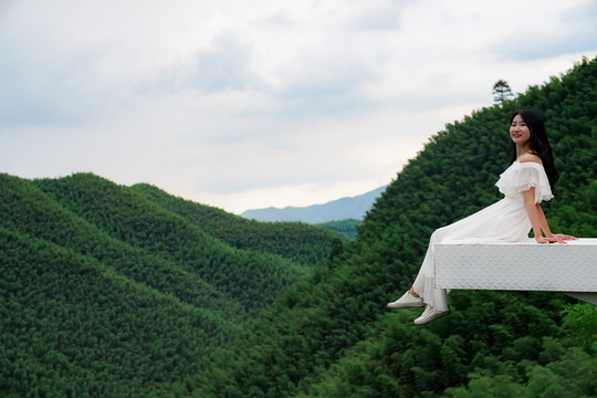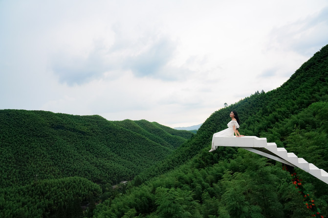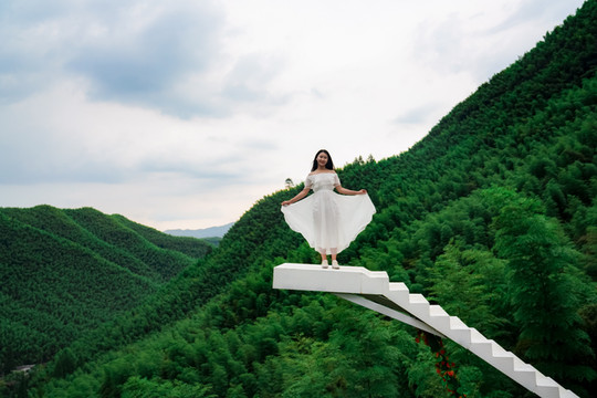 旁边还有网红爱情天梯,走上洁白的天梯,一览众山小,脚下就是波澜壮阔的大竹海,山间清风拂面,一袭白裙在风中起舞,美到极致。
