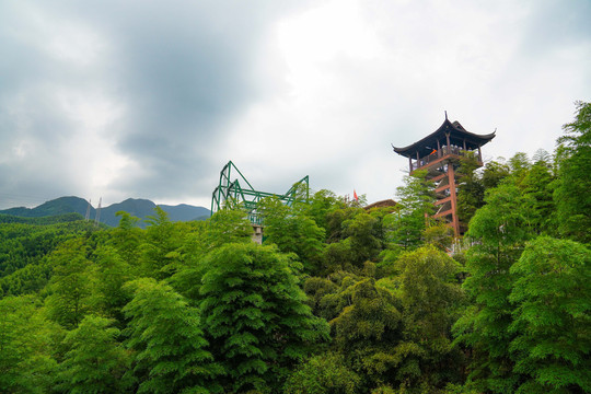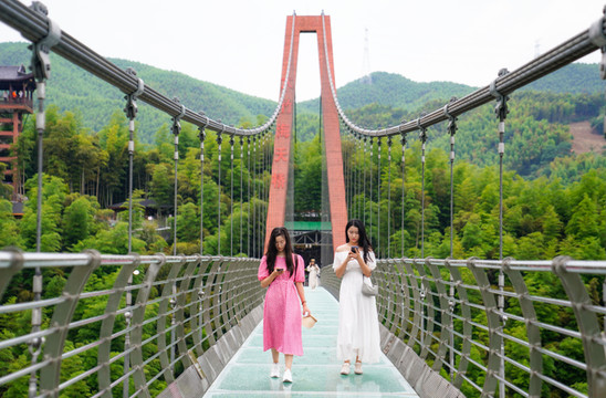 在这儿欣赏美景后可以玩更加刺激的玻璃栈桥。竹海玻璃天桥横跨两座山之间,全长468米,离地面高度107米,据了解,这也是中国最长的竹海玻璃天桥。站在全透明的玻璃栈道上,有种悬空万丈深渊的感觉,刺激有趣。