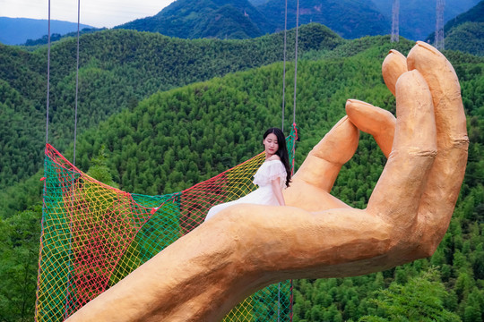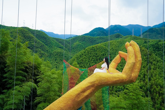 通天佛手也是非常受欢迎的打卡地点,黄金色的佛手伸向天际,在佛手中央,或站或坐,背景竹海与天空相互映衬,恍如仙境。