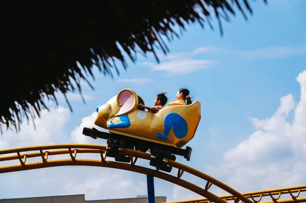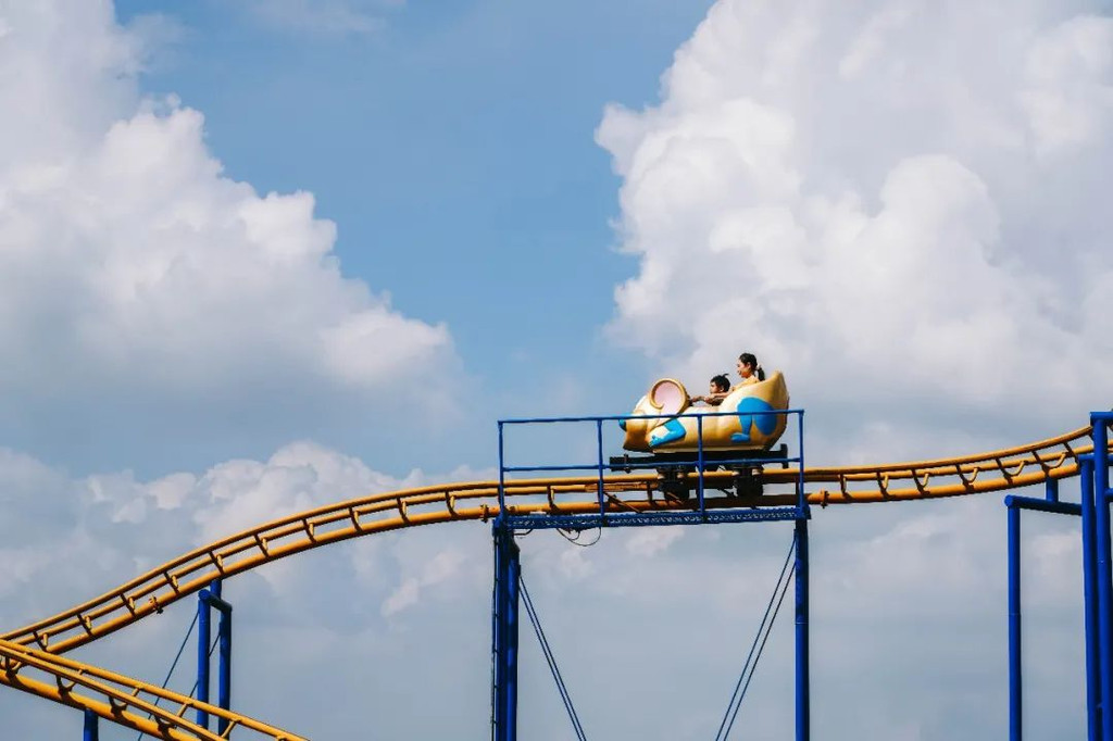 田园过山车适合爸爸妈妈带小朋友一起坐,转弯的时候肾上腺素飙升,和元宝一起体验了风驰电掣的酣畅感。