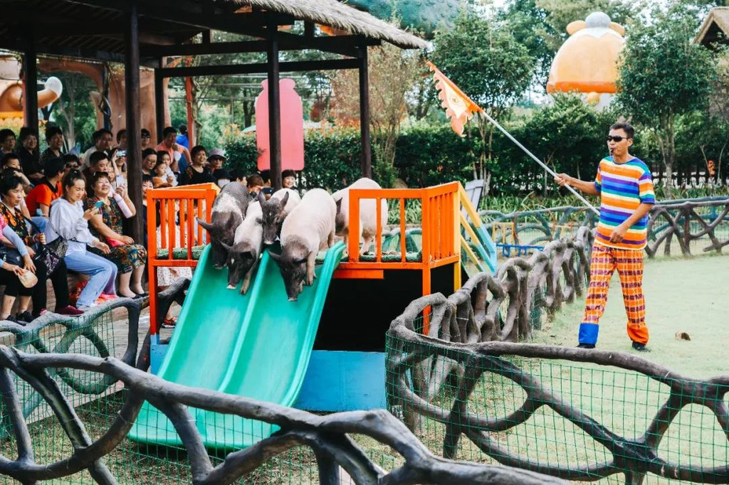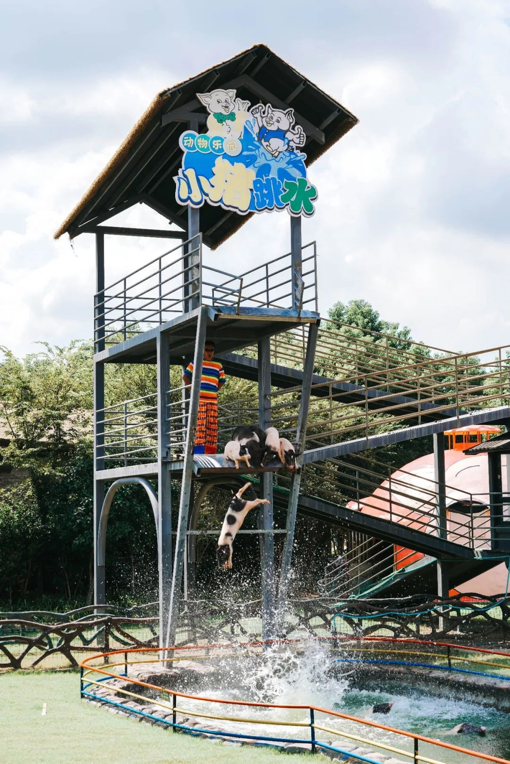 小猪化身运动员激烈赛跑,转眼间又变身为跳水运动员展现高超的跳水技能,既别开生面又乐趣横生,引得游客们纷纷鼓掌叫好。