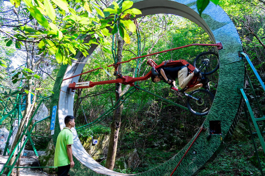半山腰的360自行车——虽然是借助器械才能360度旋转,不过,等整个人颠倒过来的时候,那感觉,还颇有点“不可名状”,这一点,这位正在转着圈的小哥下来后[赵1] ,脸上的表情就说明了一切。
