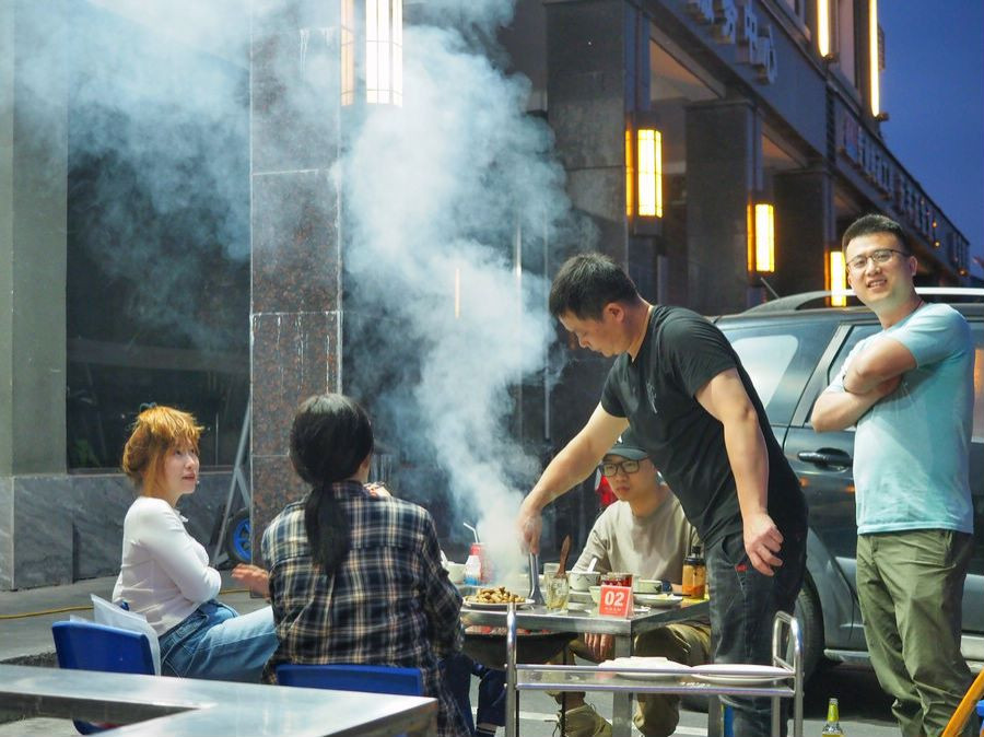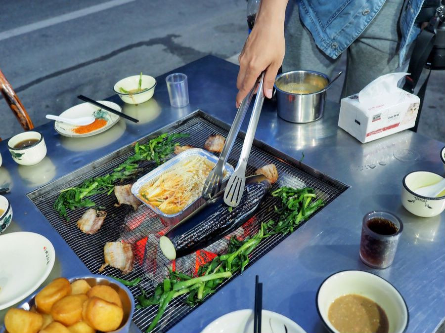 到了夜晚,街边都是烧烤店,五花肉,年糕,牛肉,鱼,韭菜,金针菇……万物皆可烤,窜起的烟火味,热气腾腾,鲜香扑鼻,这是独属于中国人的烟火味道。