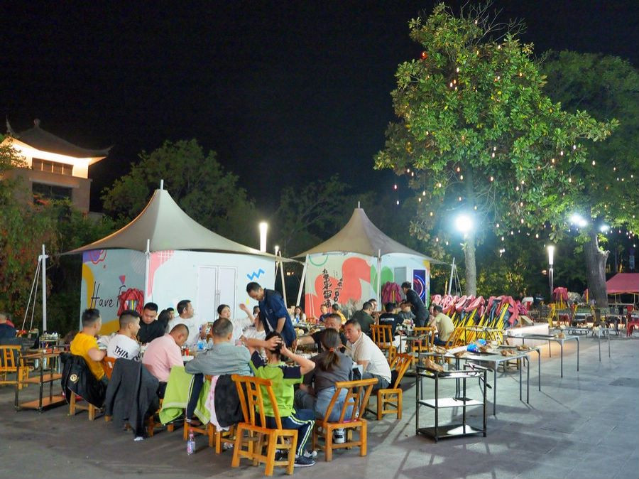 酒足饭饱,几个人摸着肚子往回走。路过青来集,发现这里也很热闹,又进去一人叫了杯喝的,慢慢走回酒店去。