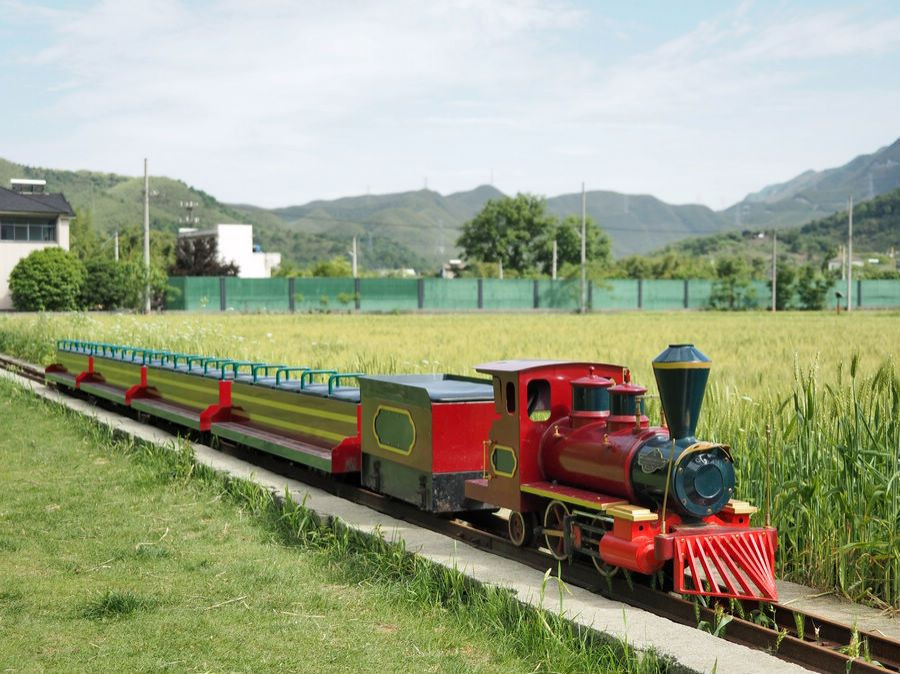 迷你小火车停在田边,不知道什么时候,就会“呜”一声,况且况且开起来。