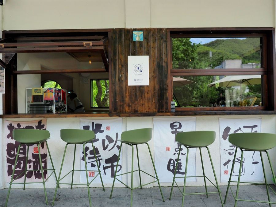 溪边有家可爱的咖啡馆,墙上写着“按时喝酒”,“坐以待币”,“早点睡”,让人看了忍俊不禁。