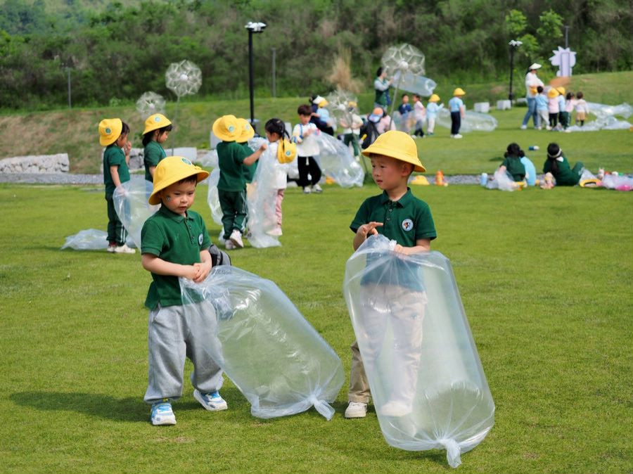 前面大片草地,草地上,有人在放风筝,也有老师带着一群幼儿园的小朋友在玩耍。