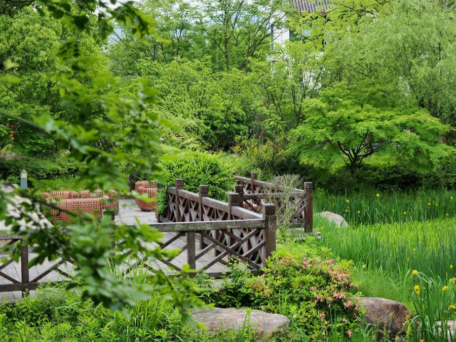 有清澈的小溪潺潺,绿道在溪边延伸,数家可爱的咖啡馆,紫色鸢尾盛开,别致的竹建筑,大片的麦田,有风的时候,简直是风吹麦浪的优美版。往竹林密布的山里走一公里,还可以去古刹探幽。