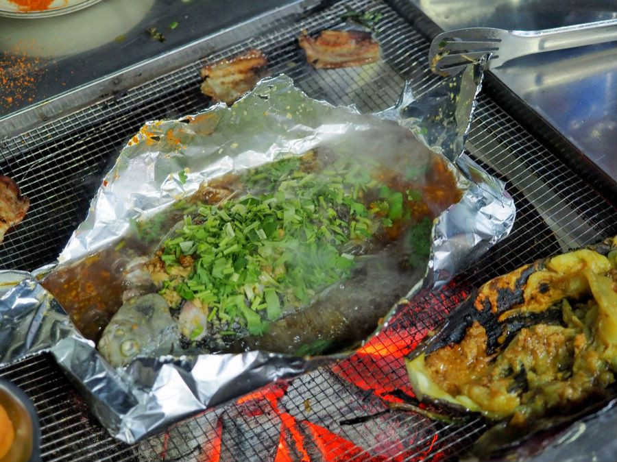 鱼用锡纸包起来再上烤架,烤熟了,先吃鱼肉,然后把年糕放到里面继续烤,过几分钟,年糕软糯了,吸饱了鱼的汤汁,无比鲜美。