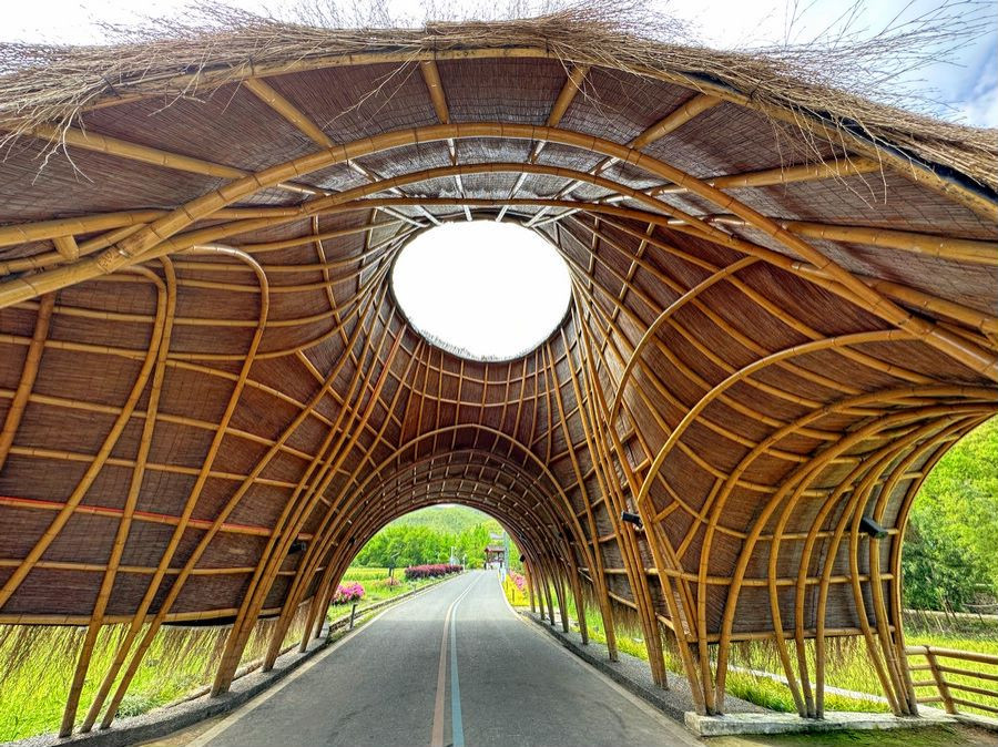 安吉盛产竹子。这几座别致的建筑,就是全部用竹子搭成,观光车,小电车,行人穿行期间,恍惚给人时空交错的感觉。