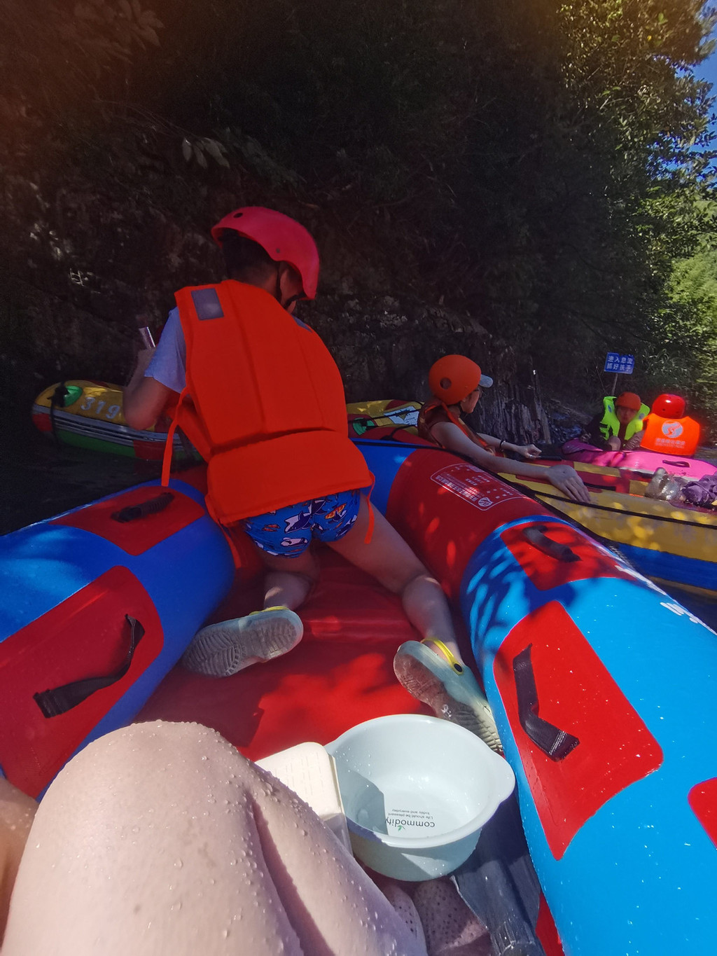 二仔非常勇猛,他负责划船,兔兔负责勺水。另外,由于每次下坡的时候,水底下的石头都是不平整的,所以屁股容易磕到。兔兔提前在网上做了攻略,买了折叠坐垫。途径一个水上小卖部,有卖饮料、烤肠之类的。还看到有人中途下来找鞋,鞋不见了找了半年没找到。