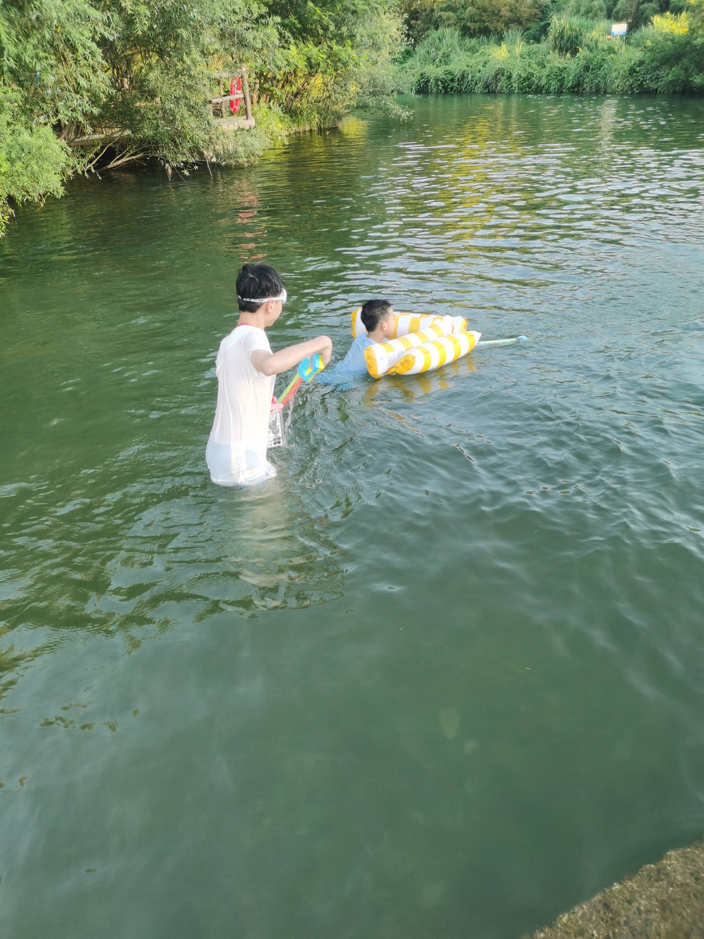 到了鱼鳞坝,这里已经有很多人了,刚刚入景区没两步,两只仔就开始打水仗了,形势已不可控。在角落找到3把椅子,于是等其他游客走了以后,搬到伞下坐着看包。二只仔跳到河里,和其他小朋友一起打水仗,期间二仔还借到一个水上沙发用来当掩护,中间是水枪,一直玩到6点半快关门了才肯出来。这边玩水枪的小朋友很多,有个小女孩的水枪飙到兔兔眼睛里了,眼睛很痒,滴了氯霉素眼药水也不见好,估计是水里的微生物引起过敏,后来几天越来越严重,滴了抗过敏的眼药水才好。
