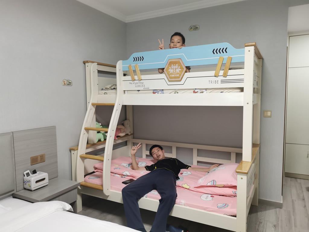 民宿装修很漂亮但材质一般,没有用防滑砖,刚提醒完二仔小心浴室滑,只见手舞足蹈慢动作突然变成了快动作,嘚瑟两下就摔倒了,还好只是乌青没有破皮,于是把浴巾垫在地上。房间里有一个1.8的大床和一个双层床,大仔和二仔各睡一天上面。最后大仔喜欢睡下面,二仔喜欢睡上面。