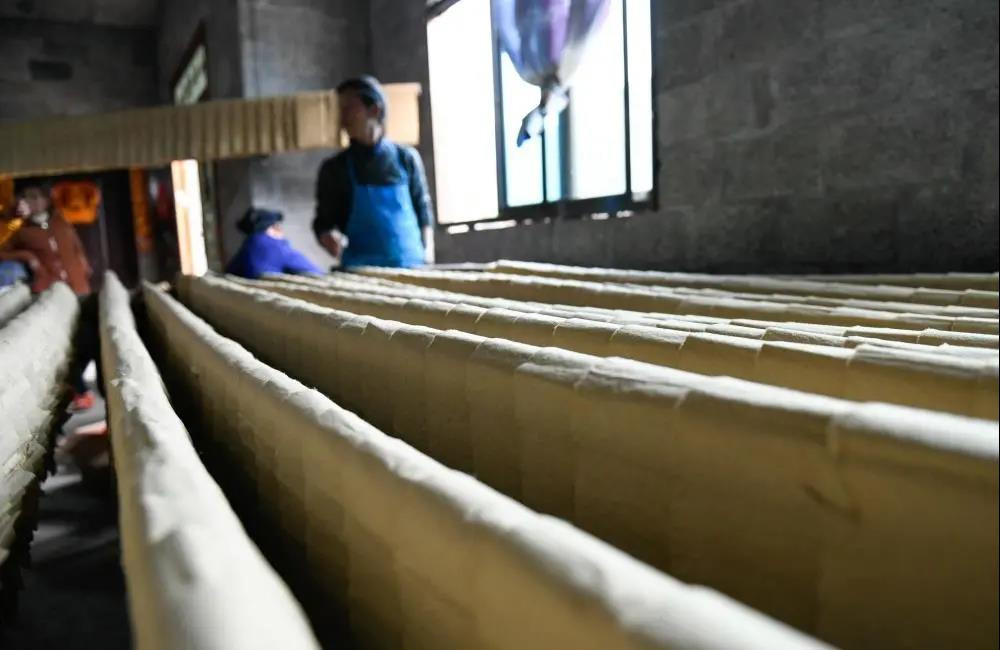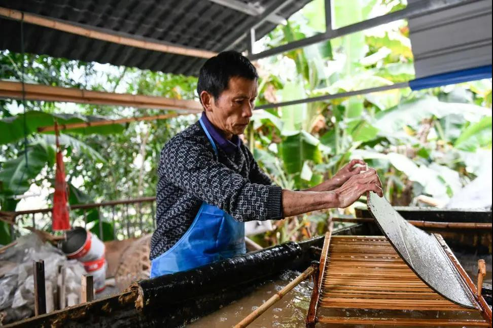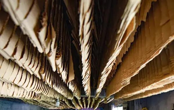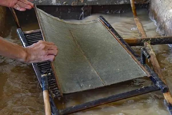 南盘江沿岸,多是郁郁葱葱的竹林。坝盘村的古法造纸已是祖祖辈辈流传至今,有近80%的人家都会造纸。坝盘古寨的村民习惯就地取材,运用被誉为坝盘村“活化石”的古法造纸工艺,以寨中盛产的竹子为原材料,经过切竹去皮、浸泡、制浆、抄纸、晾晒等多道工序,生产出质量上佳的竹纸。