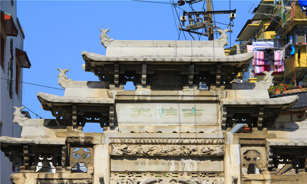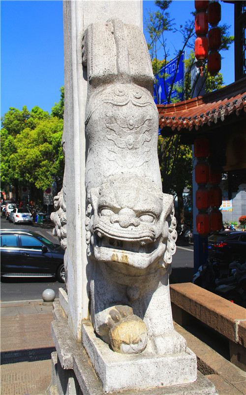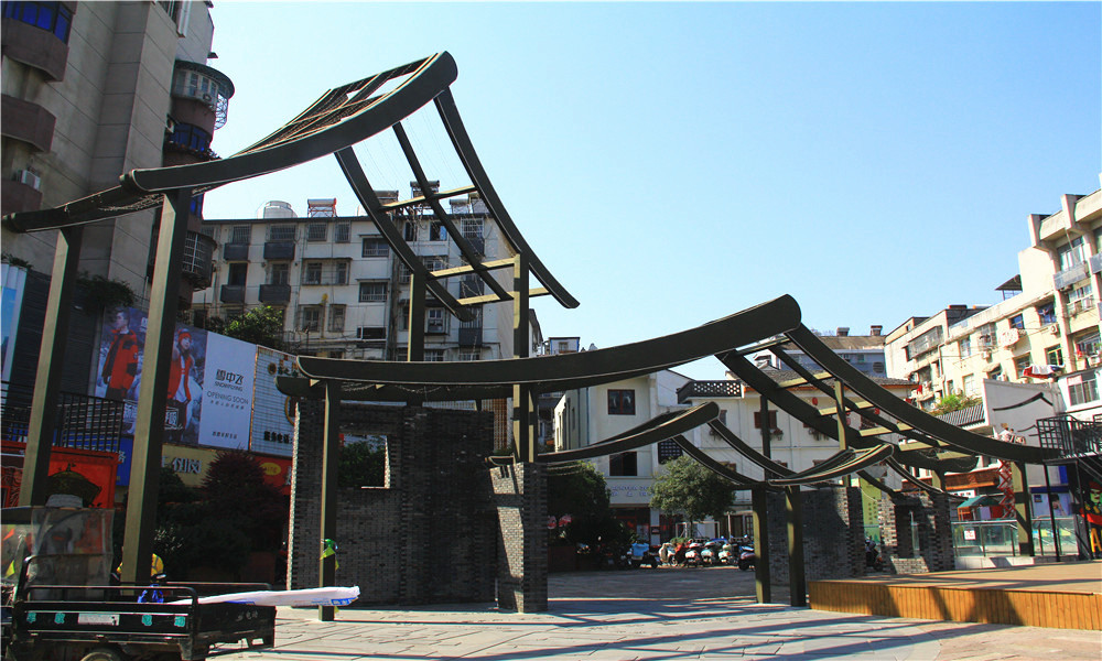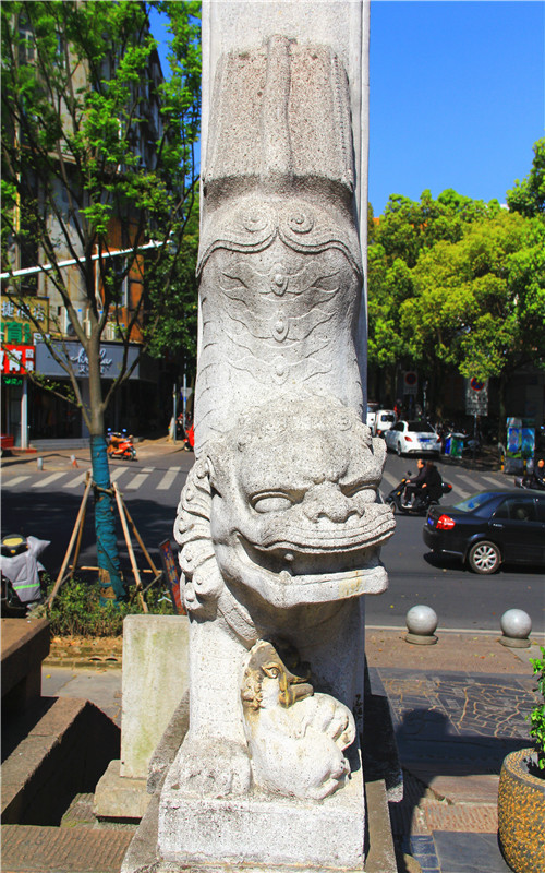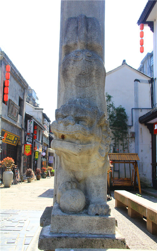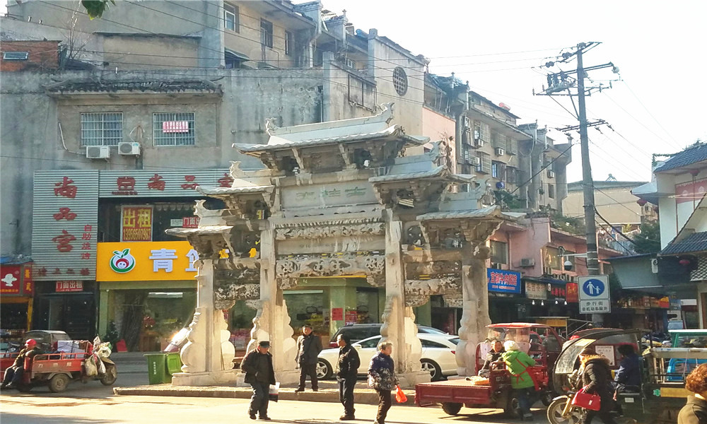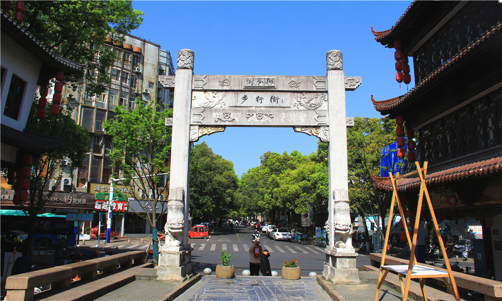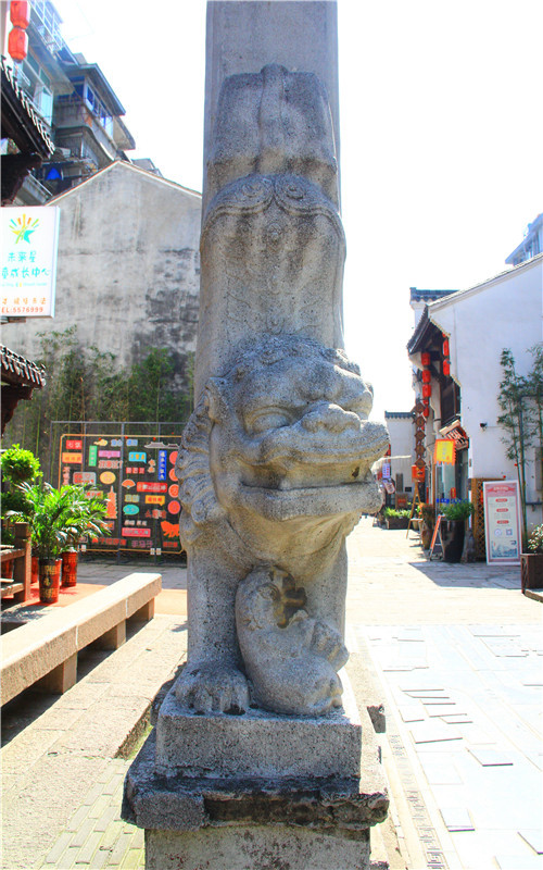 倒扒狮步行街位于安庆市老城区内,因倒扒狮古牌坊而得名。