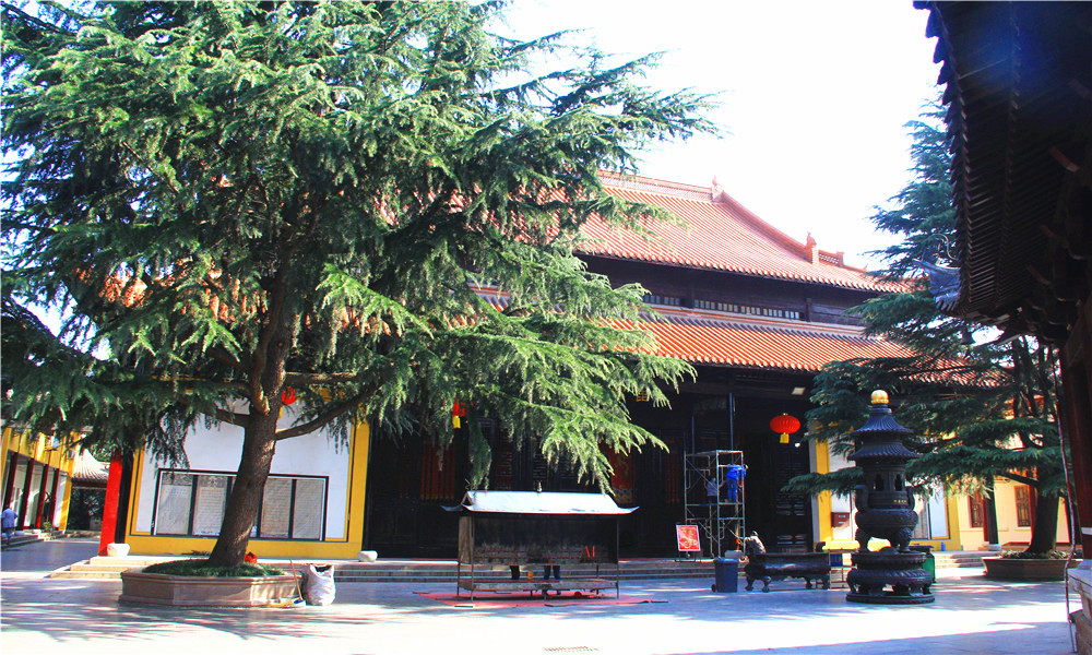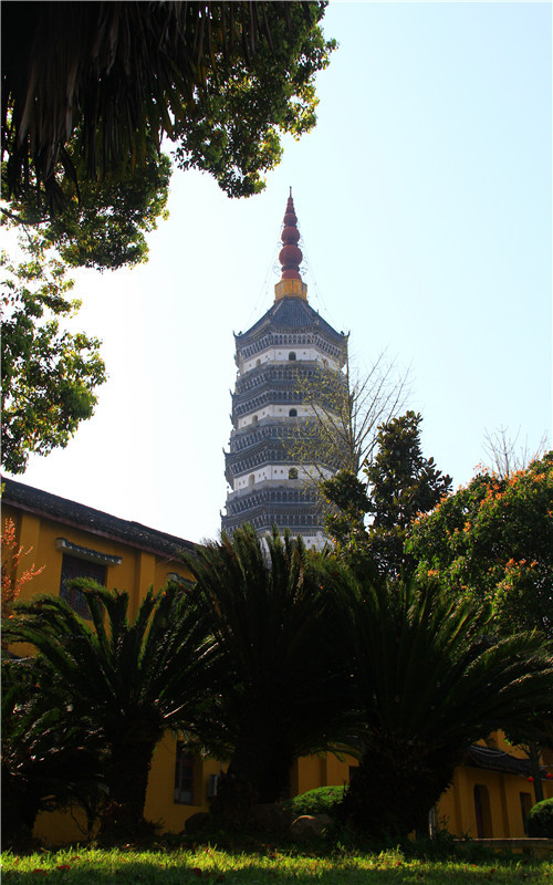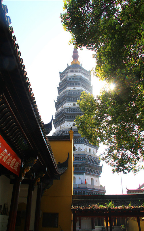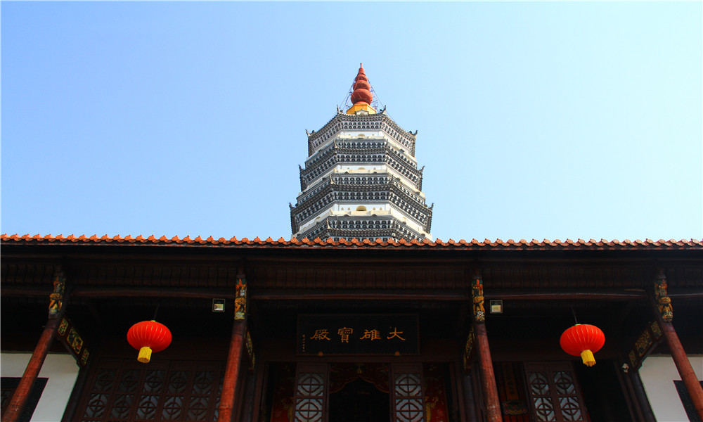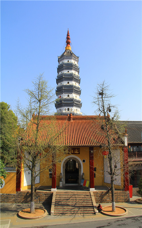 迎江寺由殿、堂、阁、楼、房、塔、园等古建筑群组合而成,占地2.2万平方米。
