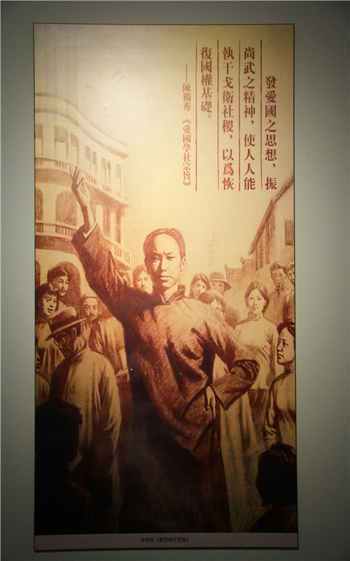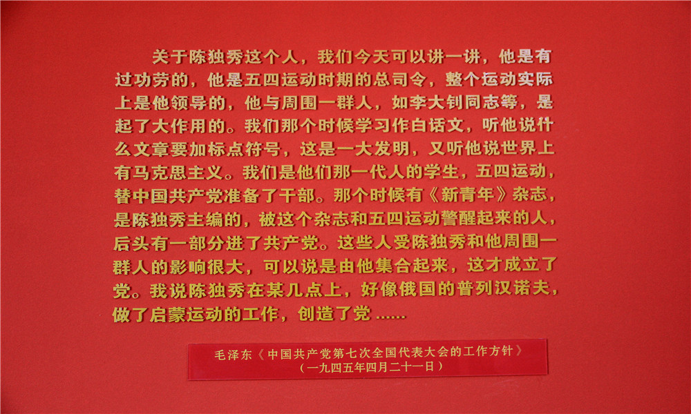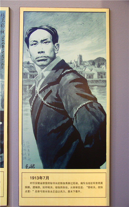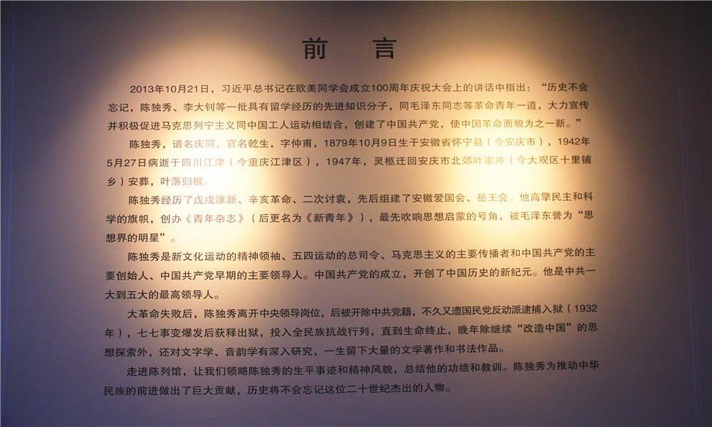 陈独秀纪念馆以大量的图片资料和珍贵的文物史料形象生动地再现了陈独秀的生平事迹,分为6个专题部分,共有实物100多件,图片300多幅,采用编年体手法展现了陈独秀一生的历程。