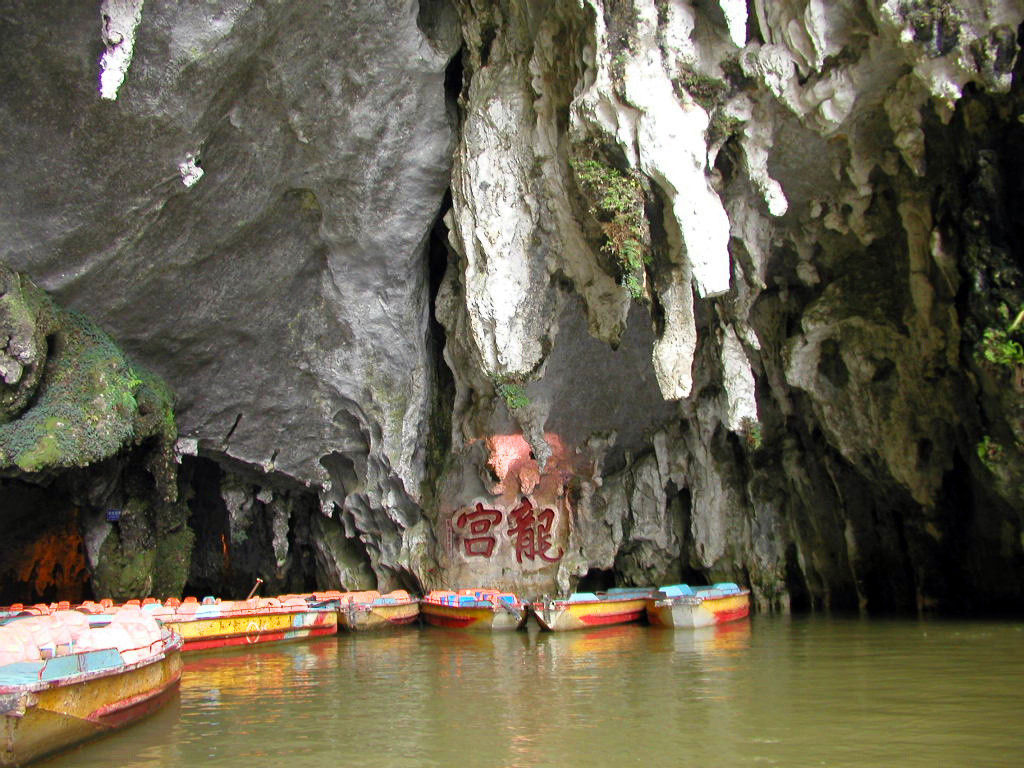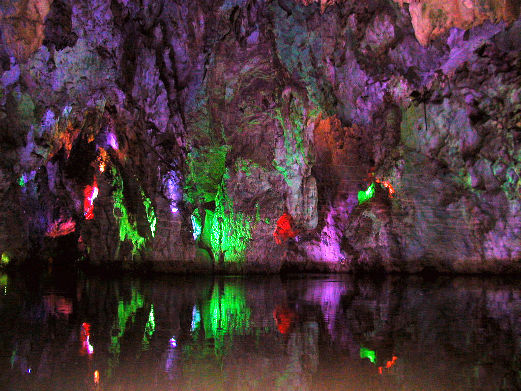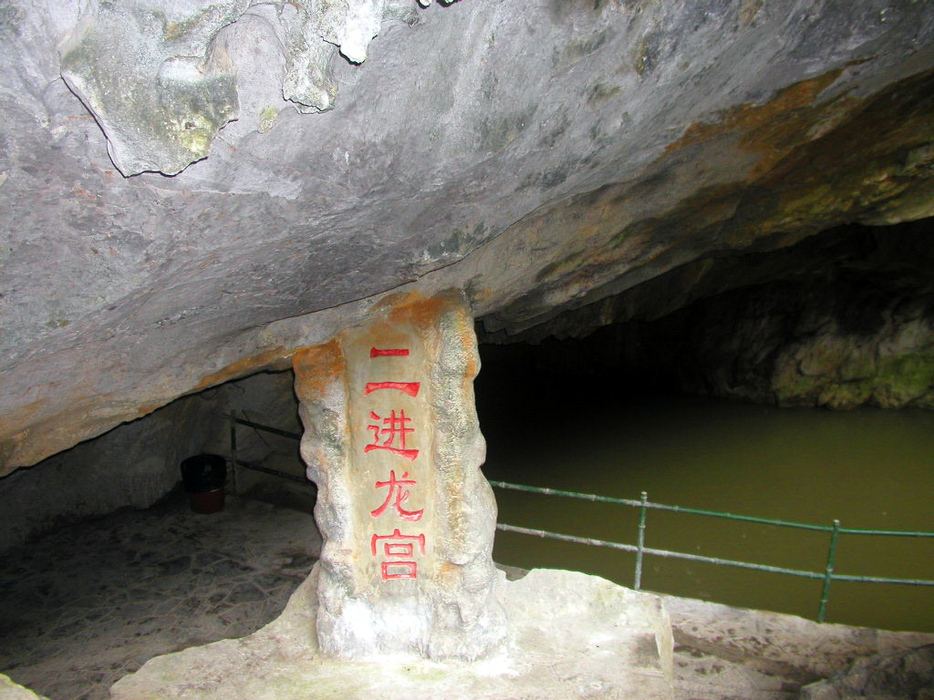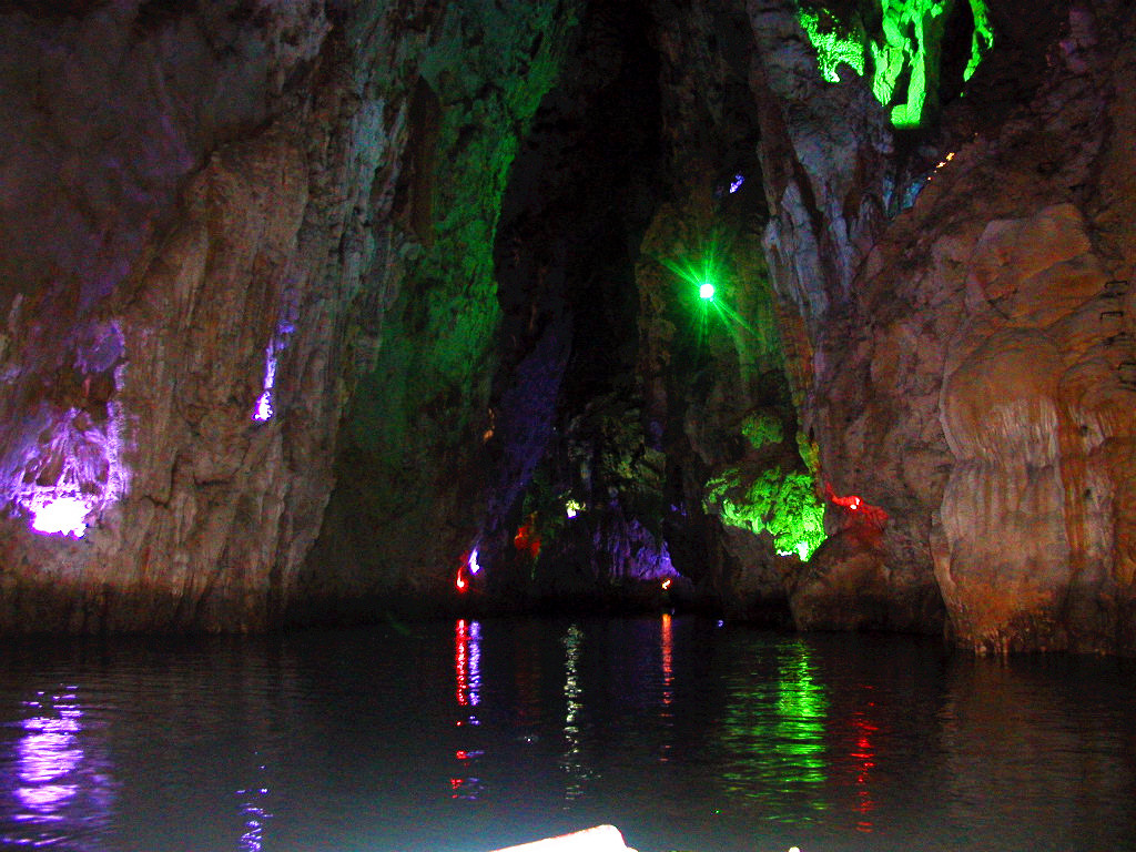 小船向前,眼前就是水上龙宫的入口,“龙宫”两个遒劲的大字赫然眼前,这是艺术大师刘海粟在90岁时游龙宫所提。船进洞,你感觉是被龙的大口吞噬了,里边一下子暗了起来。亮起了五颜六色的灯,更增加了洞中的神秘氛围。迎接你的是数十条从洞顶伸出悬挂在半空的细长的钟乳石,它们似龙似蛇,在水面掠过,在洞顶腾飞,这就是龙宫的第一洞厅,“群龙迎宾厅”,有龙相迎,你自然是贵客了。水波晃动,头顶的龙倒映在水中,看时就像群龙戏水一般。往前就来到“浮雕壁画厅”,灯光照射的地方,是大自然的刀斧神功,在岩壁上刻画出了美丽的画卷。小船经过一个狭窄的水道,导游会提醒你低头弯腰,因为你要经过的是被侯宝林大师幽默的称为“礼貌石”的巨石,距水面不过一米,任何人到这里都得低头弯腰。小船慢慢划进三厅,这里被叫做“五龙护宝”。因为洞顶悬挂着5条龙形的钟乳石,他们威武雄踞,镇守在这里,共同保护着小龙女的寝宫。