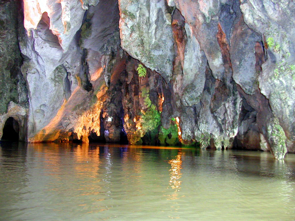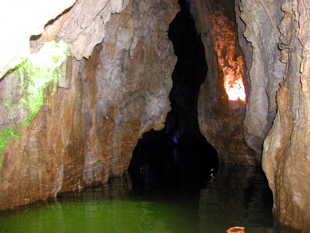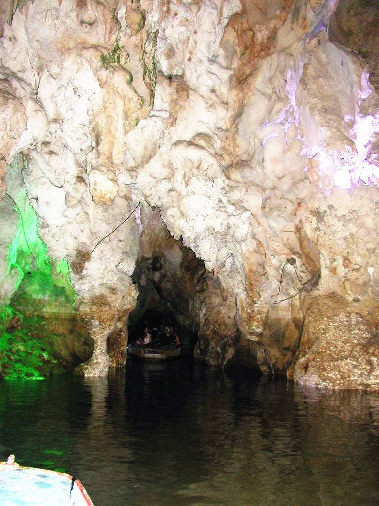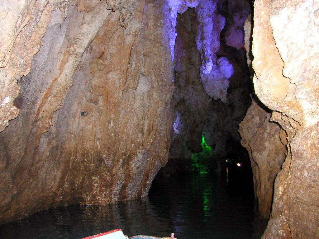 小船向前,眼前就是水上龙宫的入口,“龙宫”两个遒劲的大字赫然眼前,这是艺术大师刘海粟在90岁时游龙宫所提。船进洞,你感觉是被龙的大口吞噬了,里边一下子暗了起来。亮起了五颜六色的灯,更增加了洞中的神秘氛围。迎接你的是数十条从洞顶伸出悬挂在半空的细长的钟乳石,它们似龙似蛇,在水面掠过,在洞顶腾飞,这就是龙宫的第一洞厅,“群龙迎宾厅”,有龙相迎,你自然是贵客了。水波晃动,头顶的龙倒映在水中,看时就像群龙戏水一般。往前就来到“浮雕壁画厅”,灯光照射的地方,是大自然的刀斧神功,在岩壁上刻画出了美丽的画卷。小船经过一个狭窄的水道,导游会提醒你低头弯腰,因为你要经过的是被侯宝林大师幽默的称为“礼貌石”的巨石,距水面不过一米,任何人到这里都得低头弯腰。小船慢慢划进三厅,这里被叫做“五龙护宝”。因为洞顶悬挂着5条龙形的钟乳石,他们威武雄踞,镇守在这里,共同保护着小龙女的寝宫。