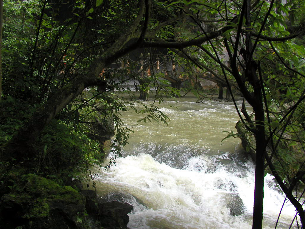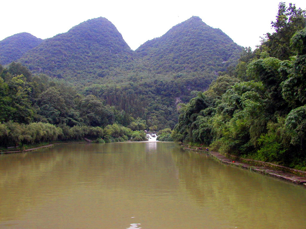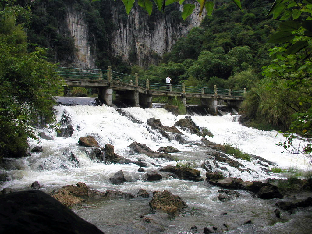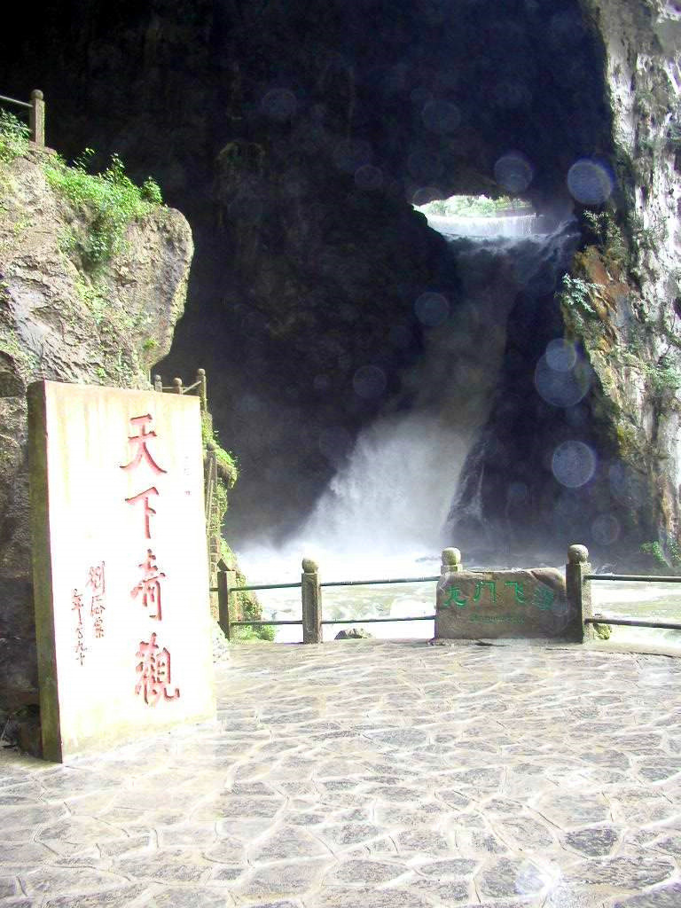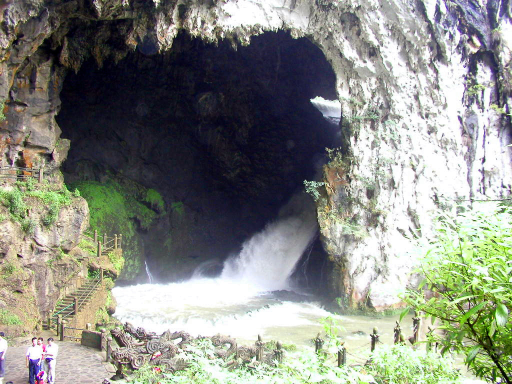 因为住在安顺,第二天一早就去了龙宫。这是国家级风景名胜区,距安顺市27公里,有高等级公路直达景区。因为到的早,还没有什么人。进入巨大的龙宫牌坊,我们走上了一条绿树成荫的甬路,道边都是卖各种旅游商品的小摊位,为了躲开人流,我们首先来到“天池”。龙宫风景区以水溶洞群为主体,更集旱溶洞、瀑布、峡谷、峰丛、绝壁、湖泊、溪河于一身,构成一幅怡然自得的人间仙境画图。天池是山谷捧出的一泓碧水,宛如天上瑶池,水色碧绿,显得平静幽深。走到池的一端,忽听巨大水声,这就是著名的龙门飞瀑了,因为头天下了雨,水流巨大,只见白花花的一片,怒吼着向下从巨大的溶洞跌拓而下,水墙壁立,宽25米,高约50米,惊涛奔涌,此即龙门。传说当年神龙从山中伸出头来,一支龙角穿破山崖,露出天窗,龙从天窗跃出,形成了巨大的龙门飞瀑。据称这里为中国地下瀑布之冠。